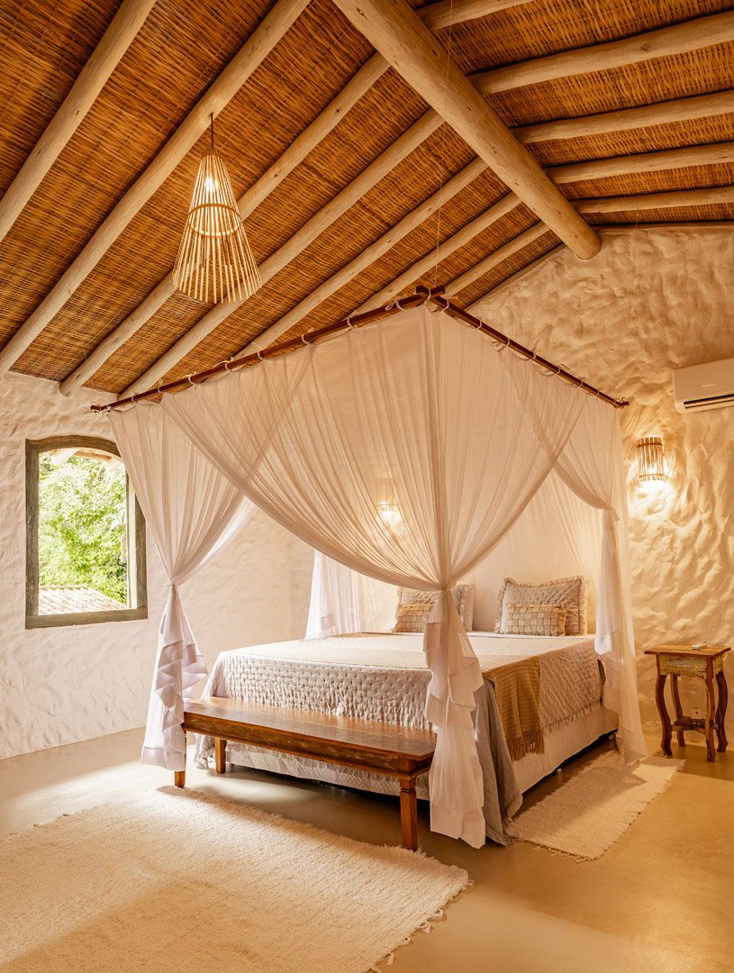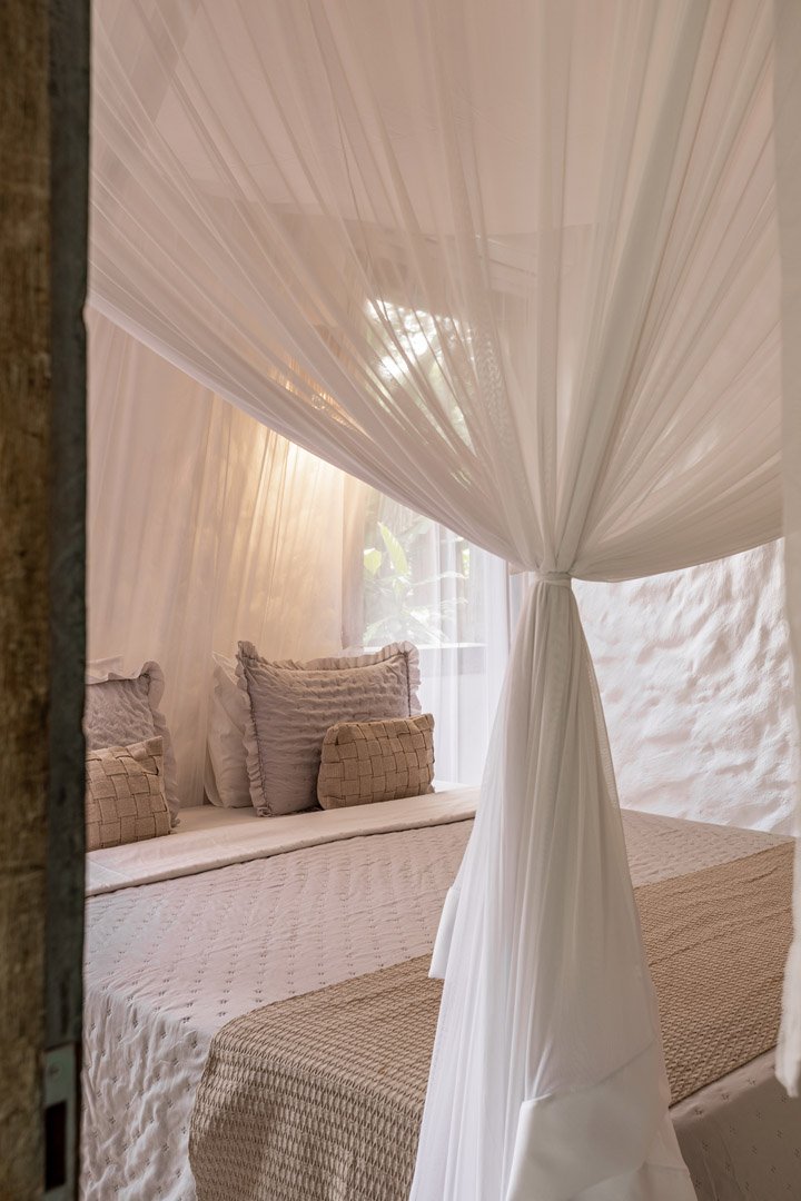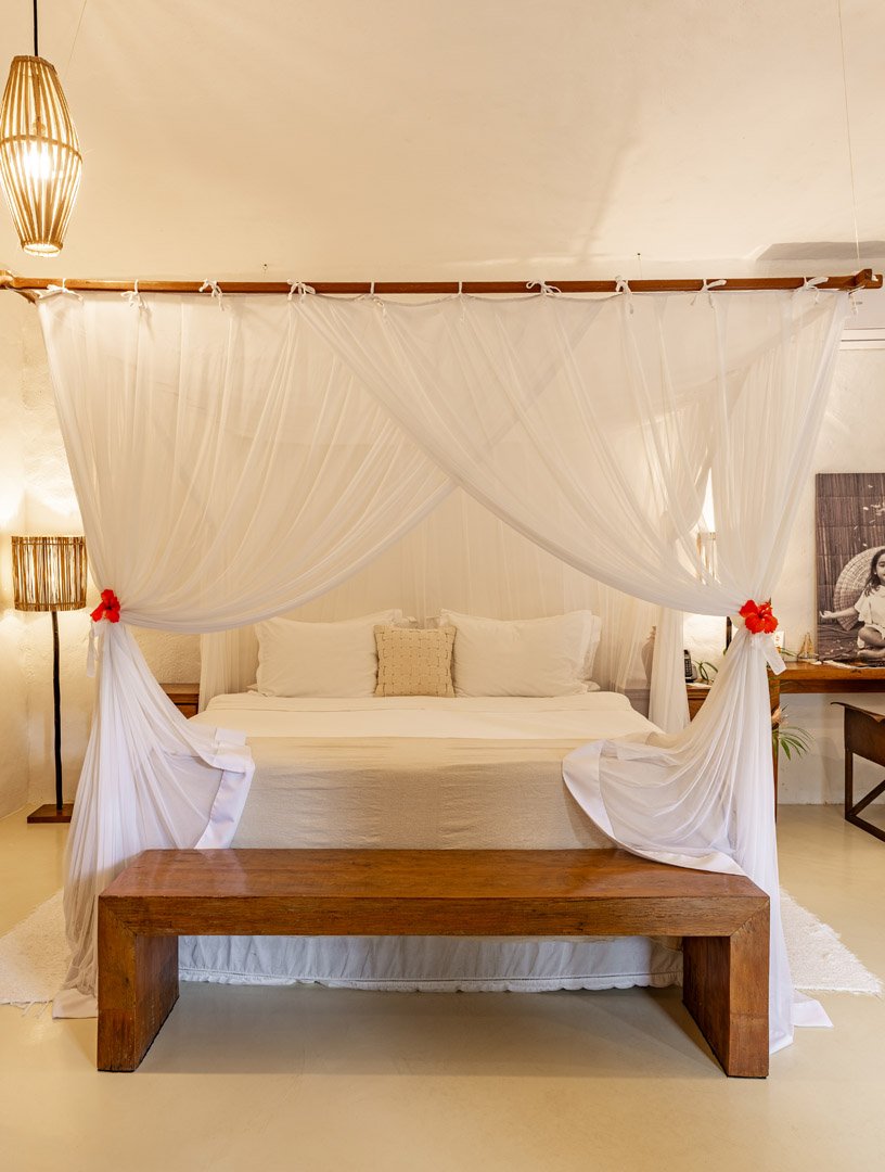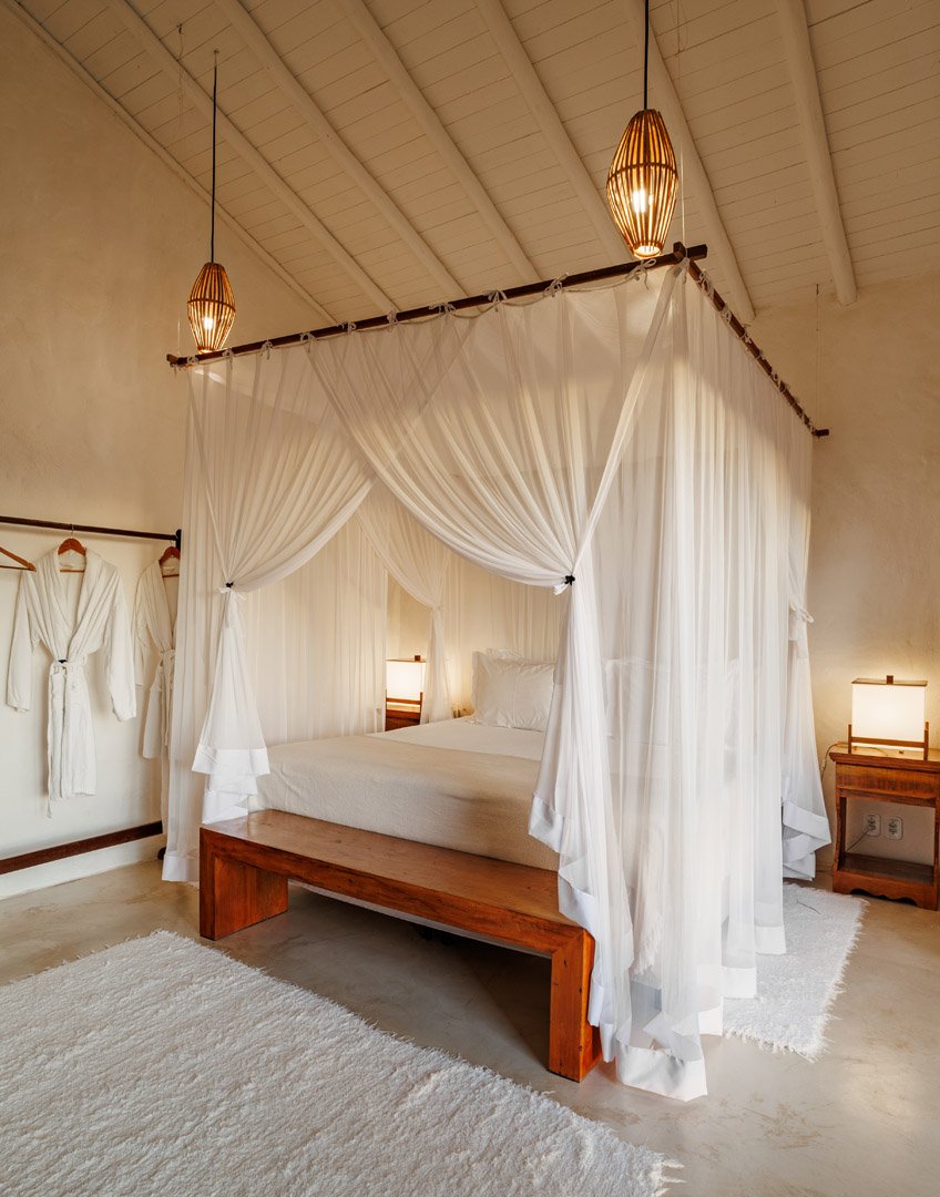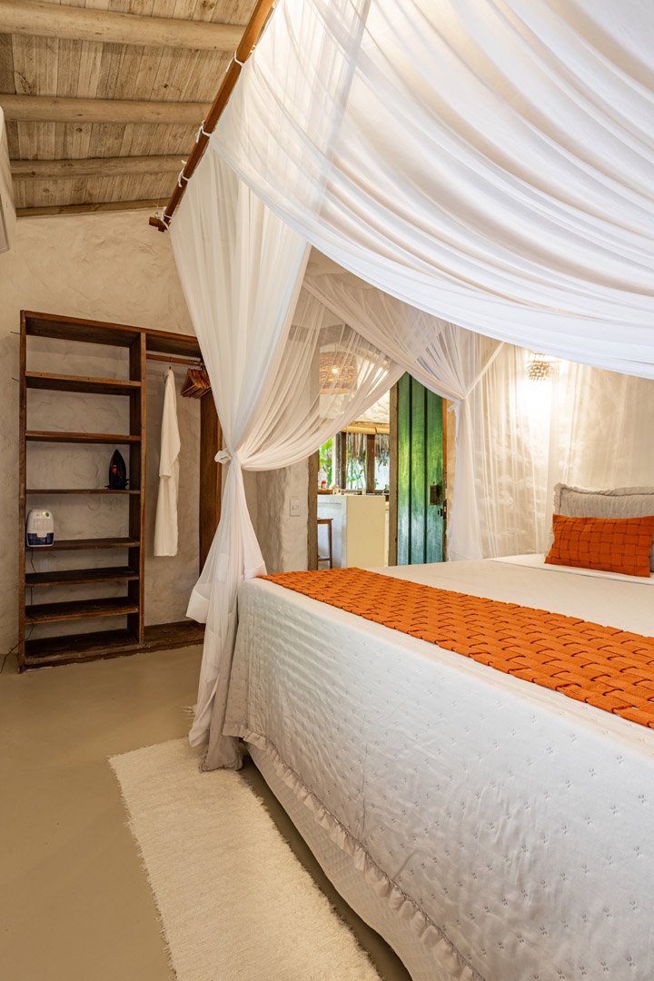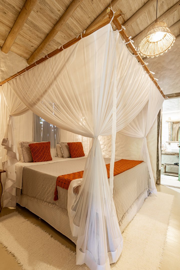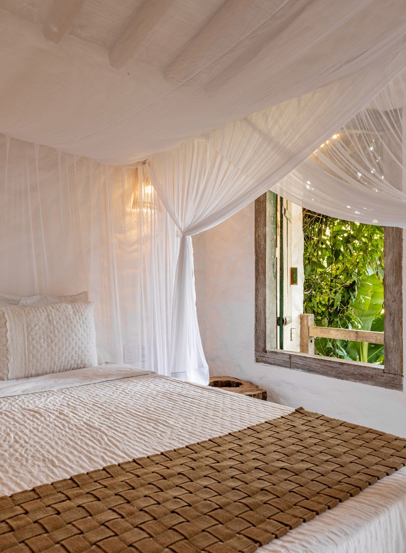 Suíte de 60m² com cama king-size, mosquiteiro dossel e varanda privativa com rede cercada pela Mata Atlântica. Closet amplo, área de estar e banheiro com amenities premium. Luxo despretensioso em meio ao jardim tropical de Trancoso.