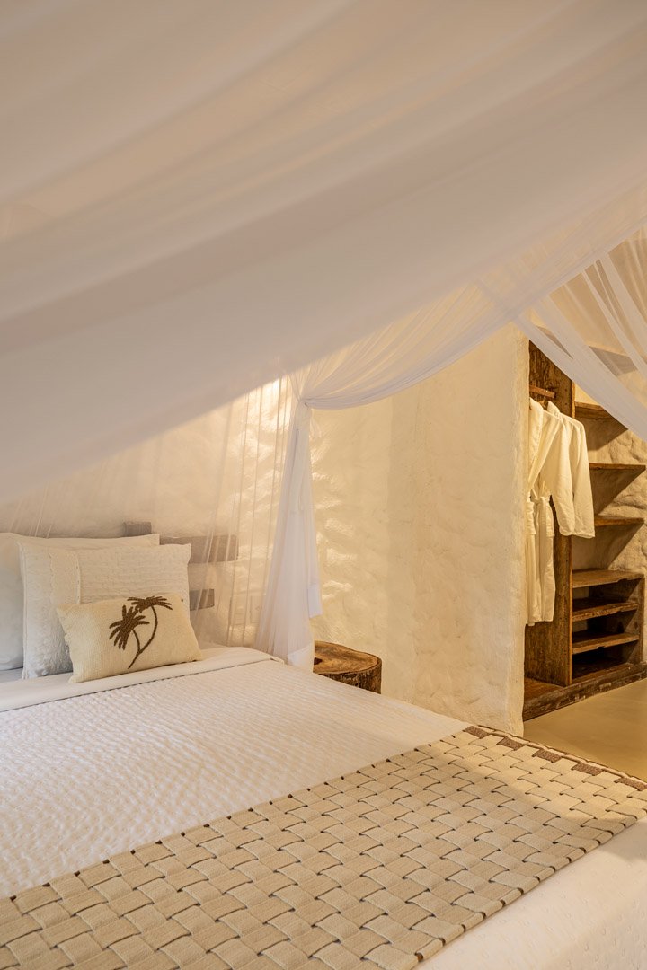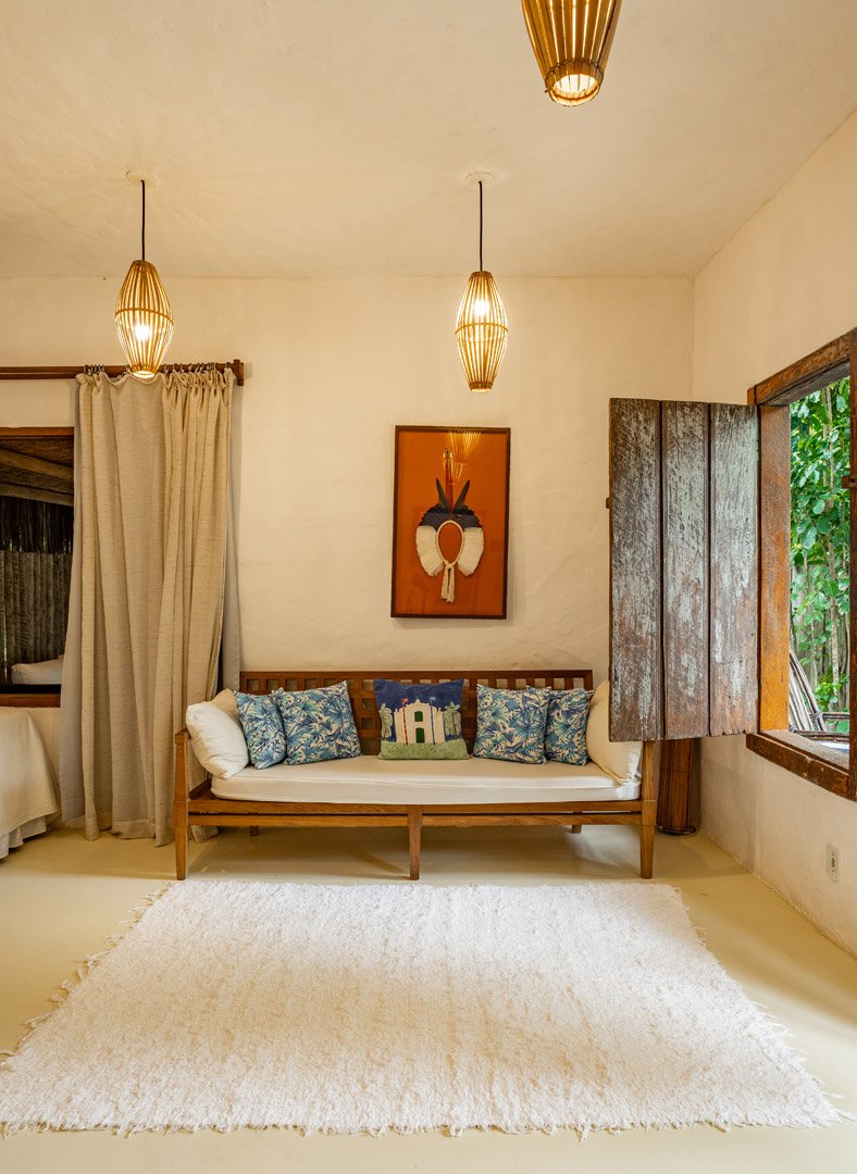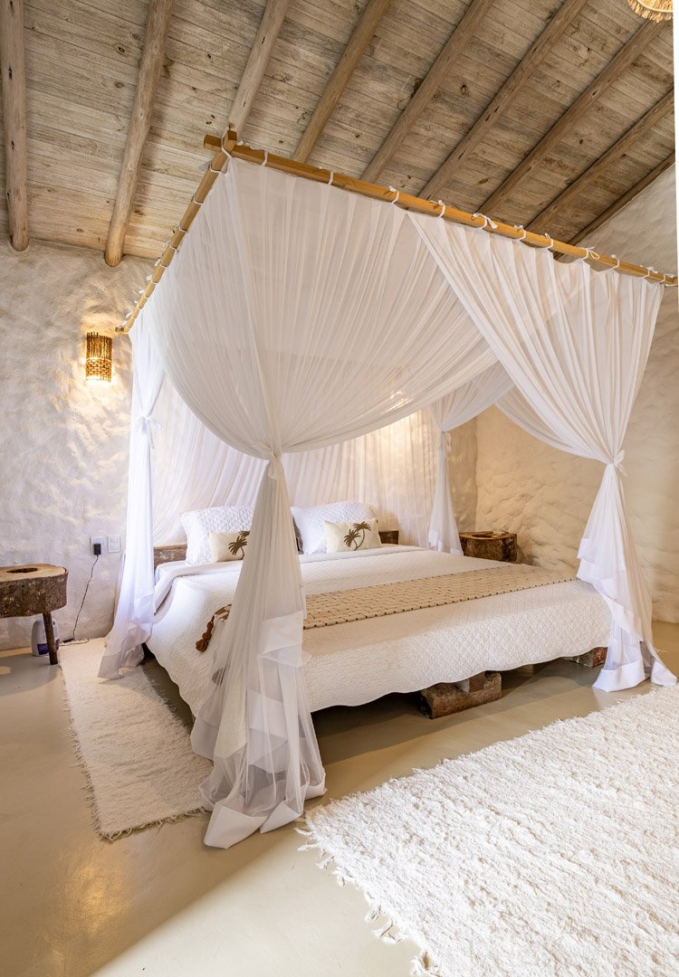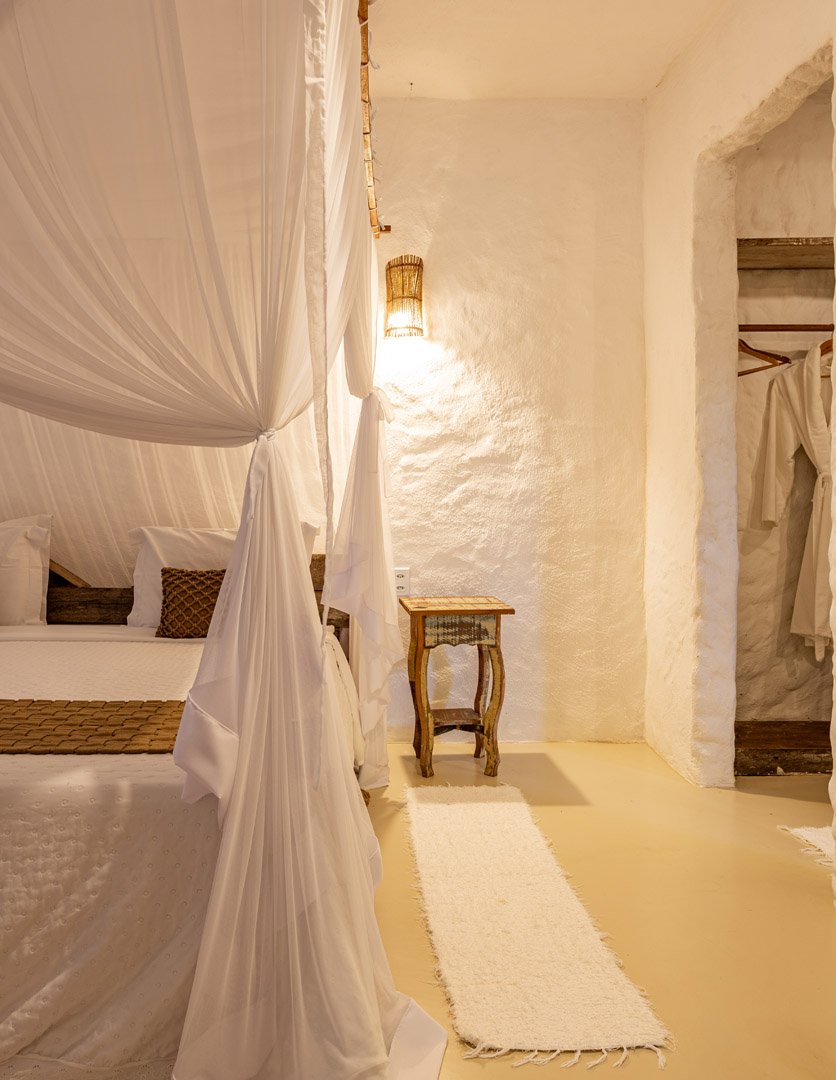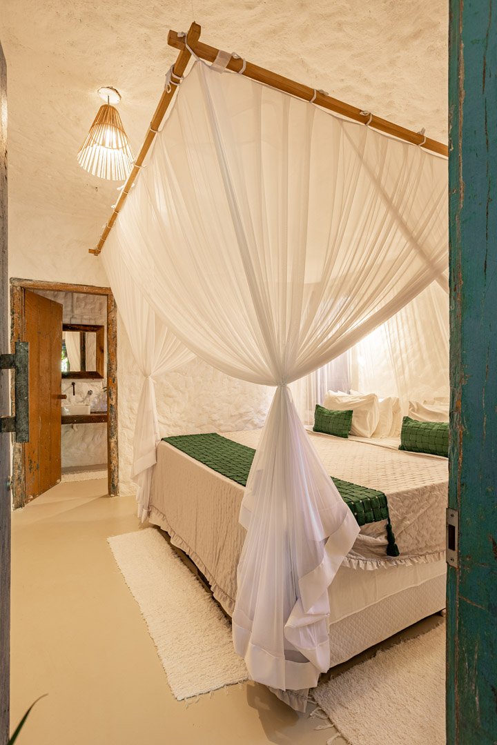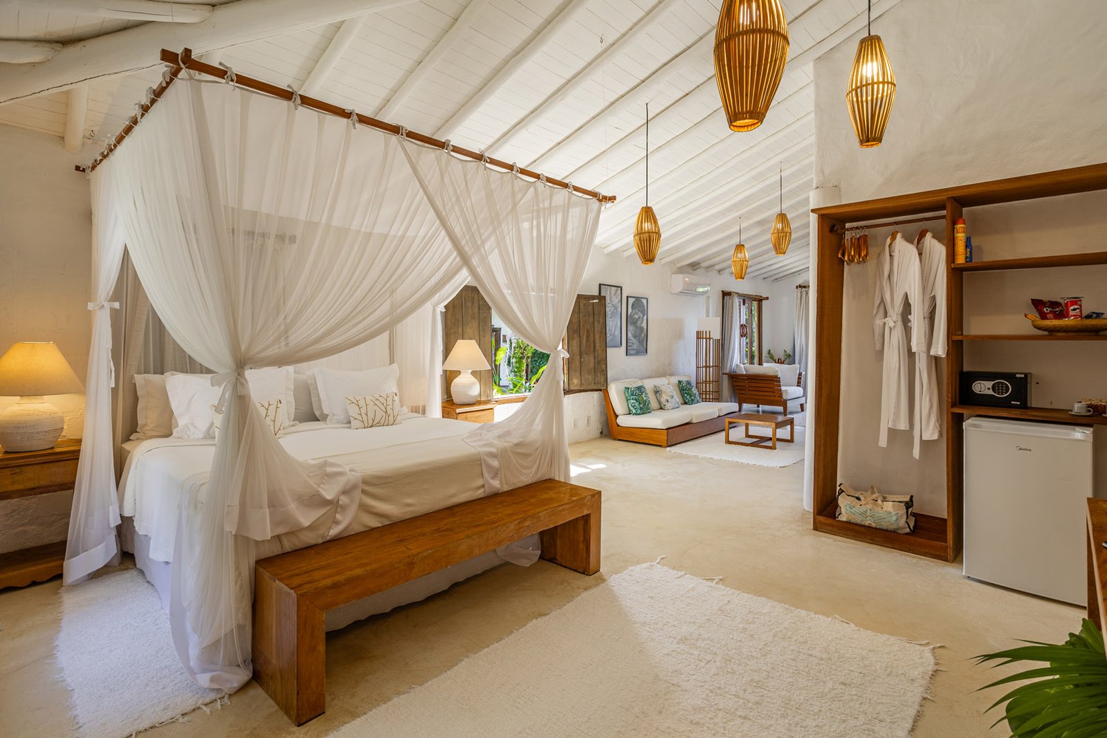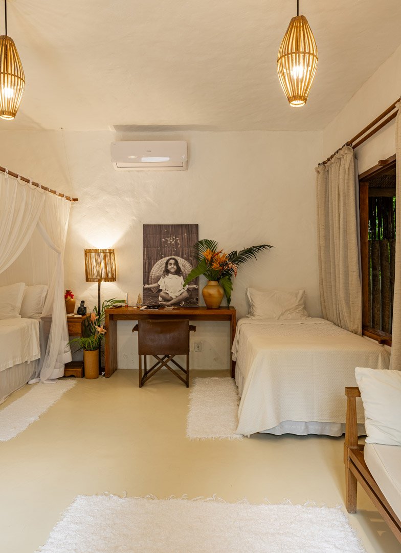 Suíte de 60m² com cama king-size, mosquiteiro dossel e varanda privativa com rede cercada pela Mata Atlântica. Closet amplo, área de estar e banheiro com amenities premium. Luxo despretensioso em meio ao jardim tropical de Trancoso.