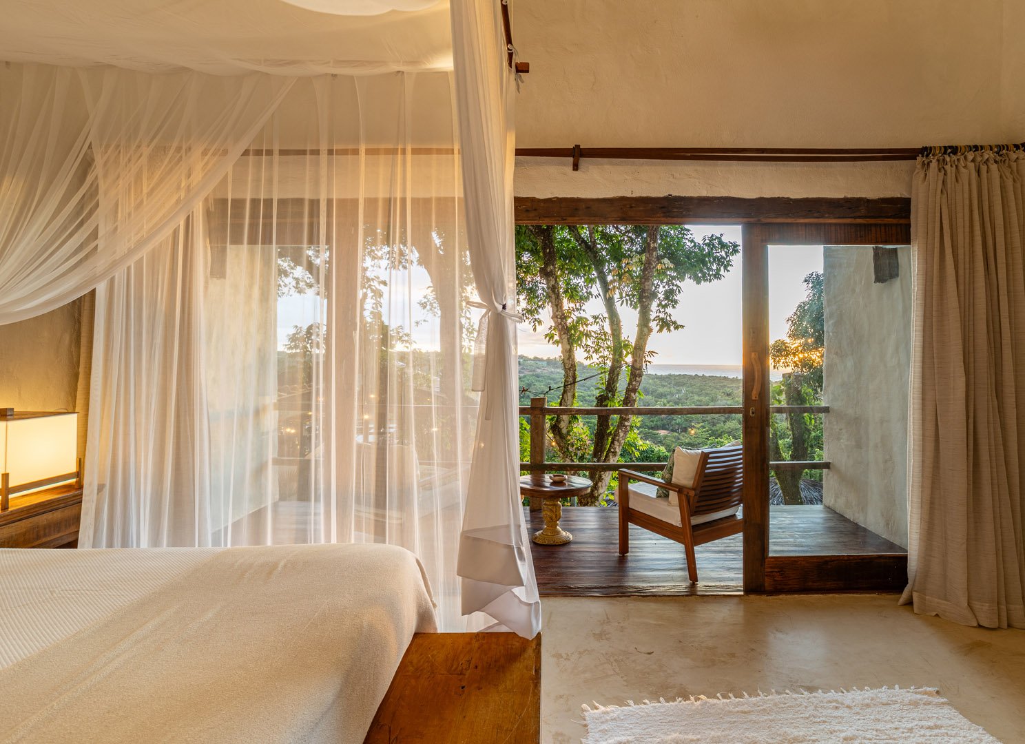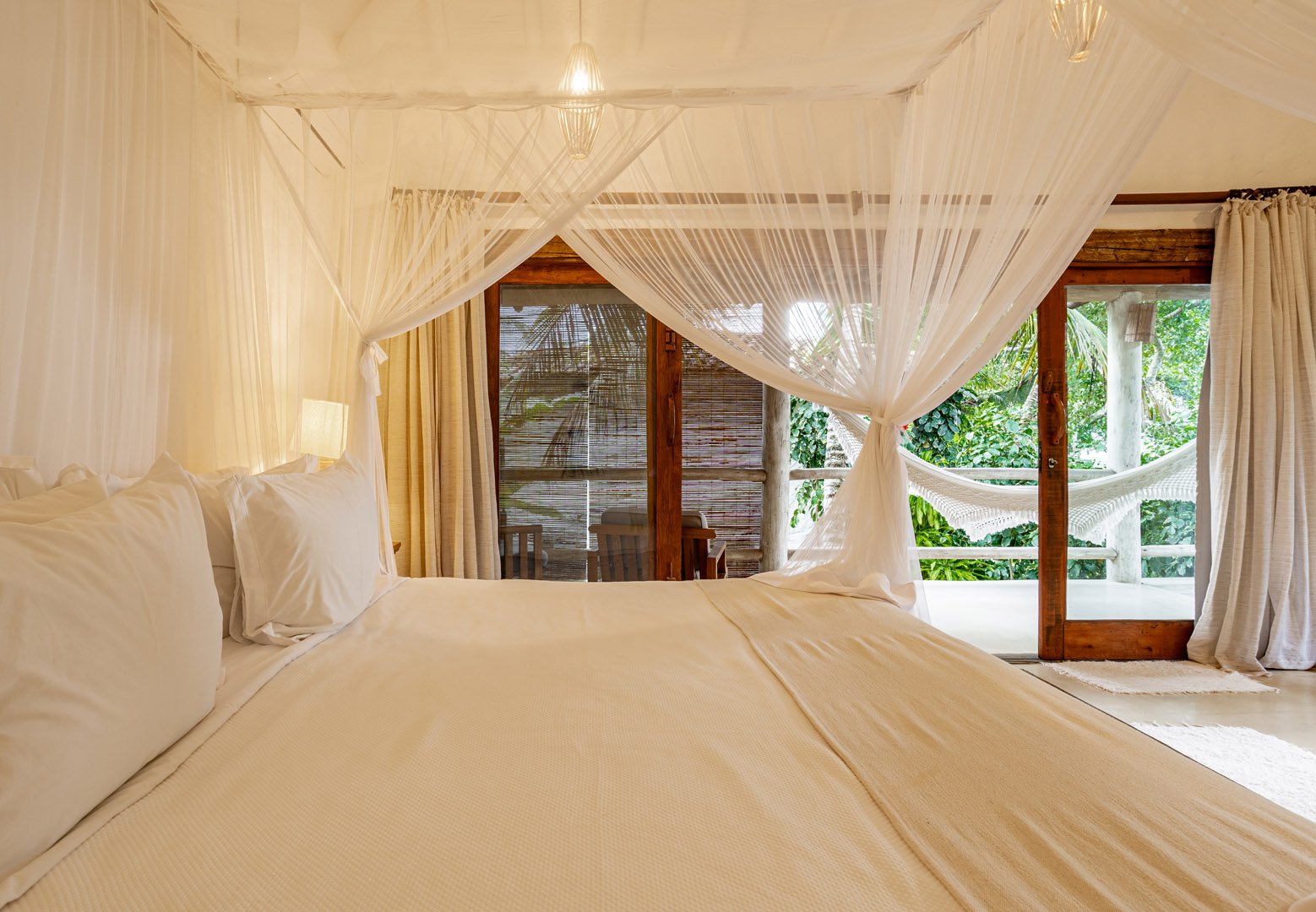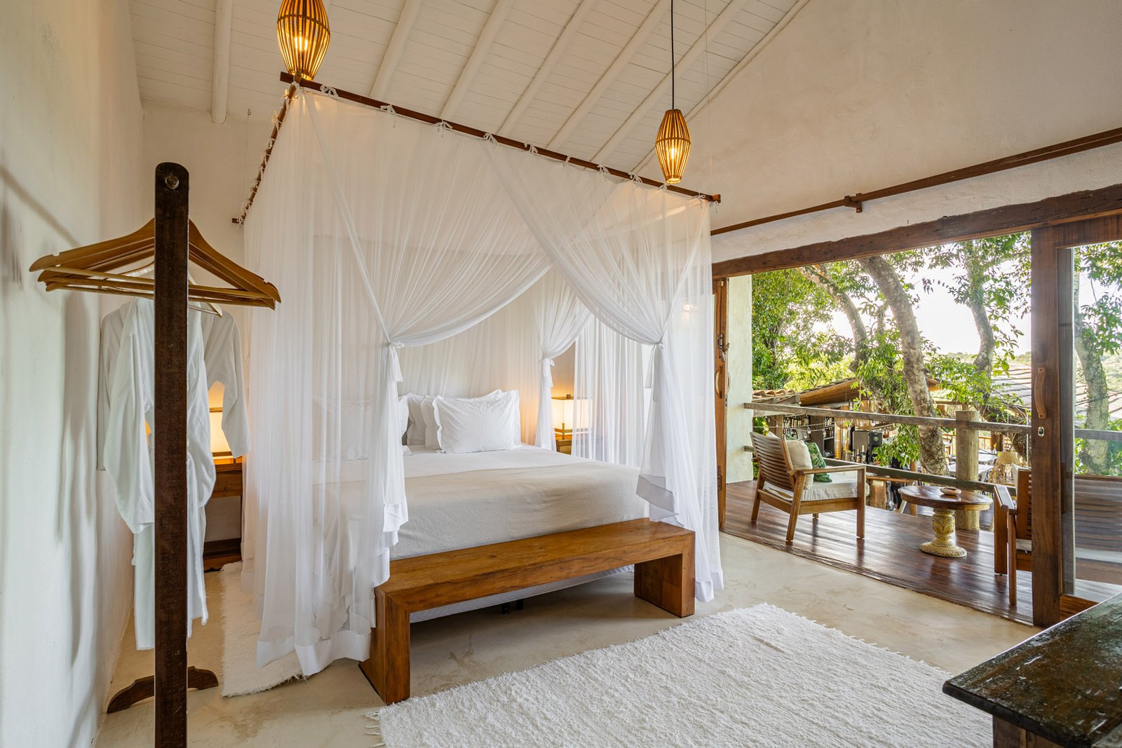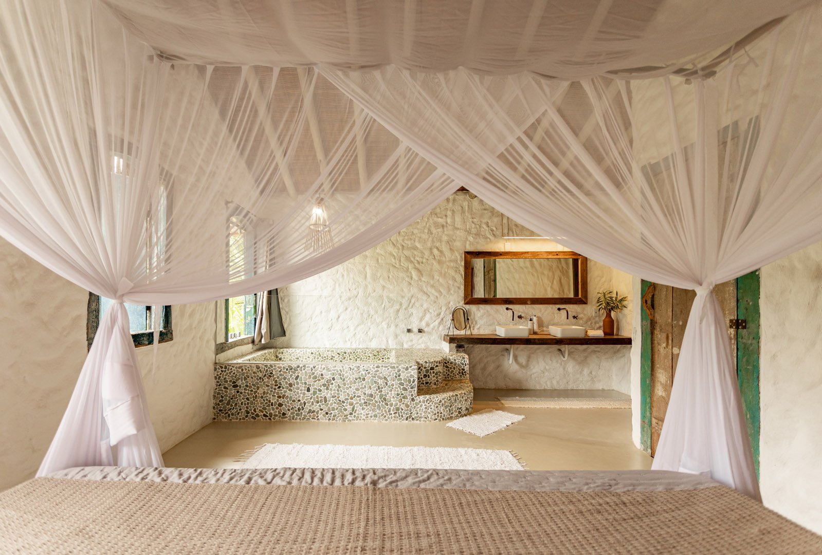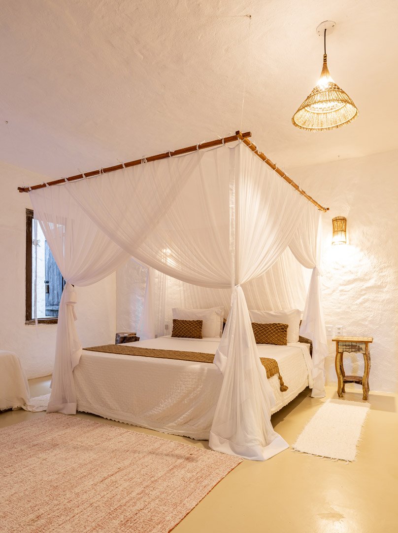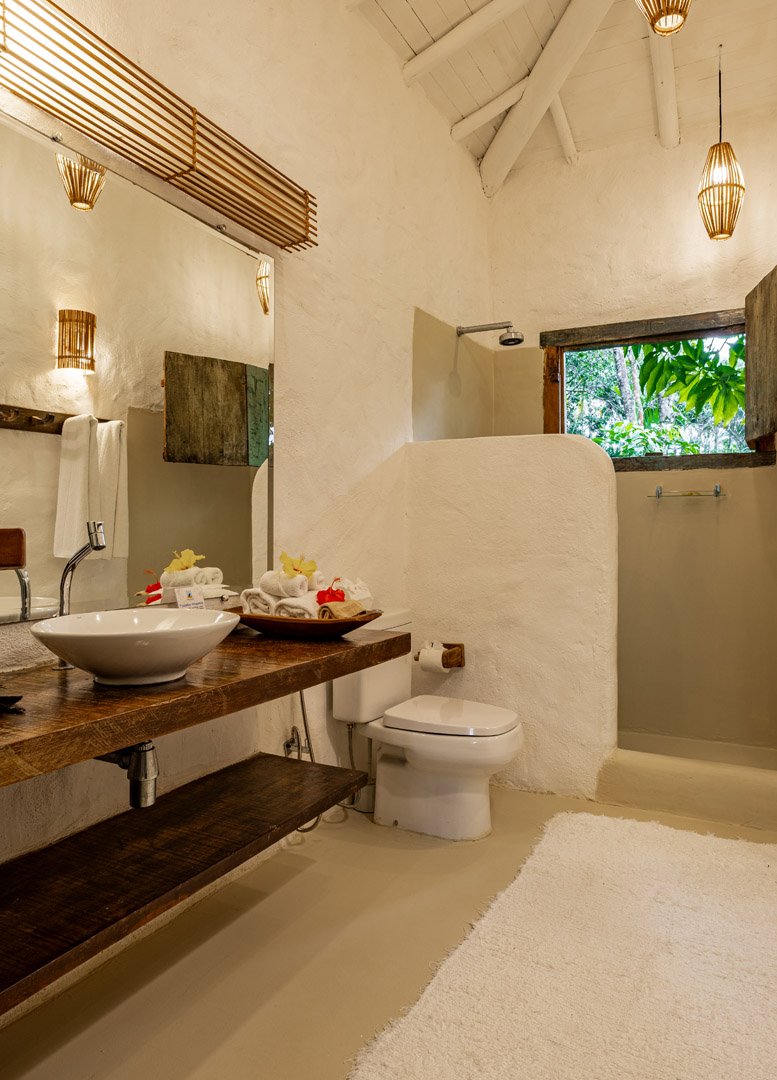 Suíte de 60m² com cama king-size, mosquiteiro dossel e varanda privativa com rede cercada pela Mata Atlântica. Closet amplo, área de estar e banheiro com amenities premium. Luxo despretensioso em meio ao jardim tropical de Trancoso.