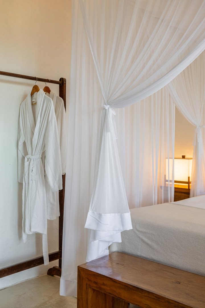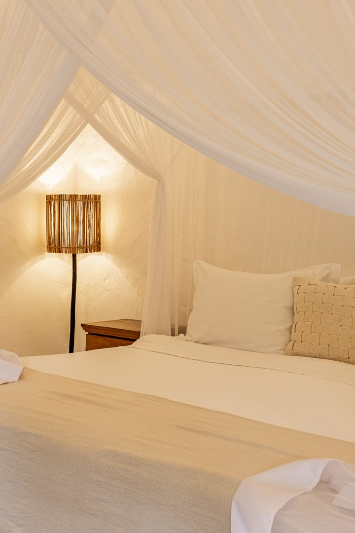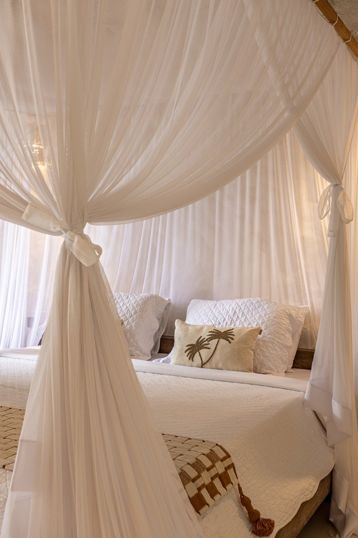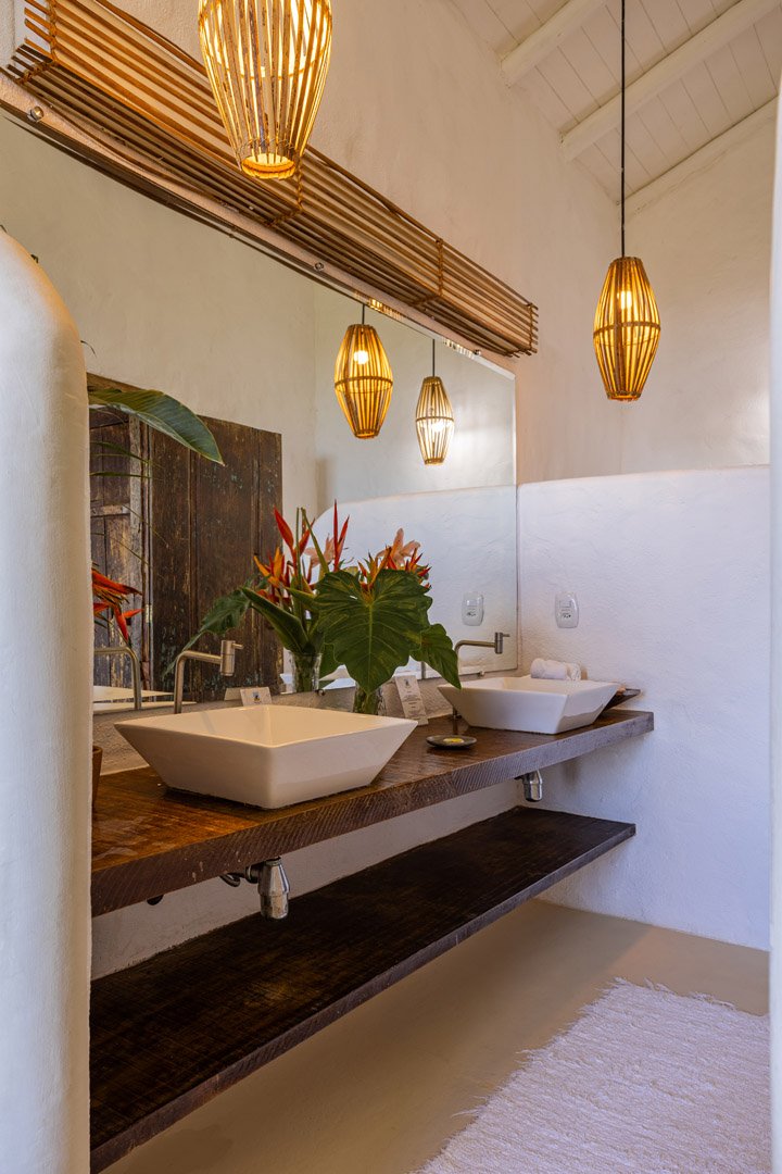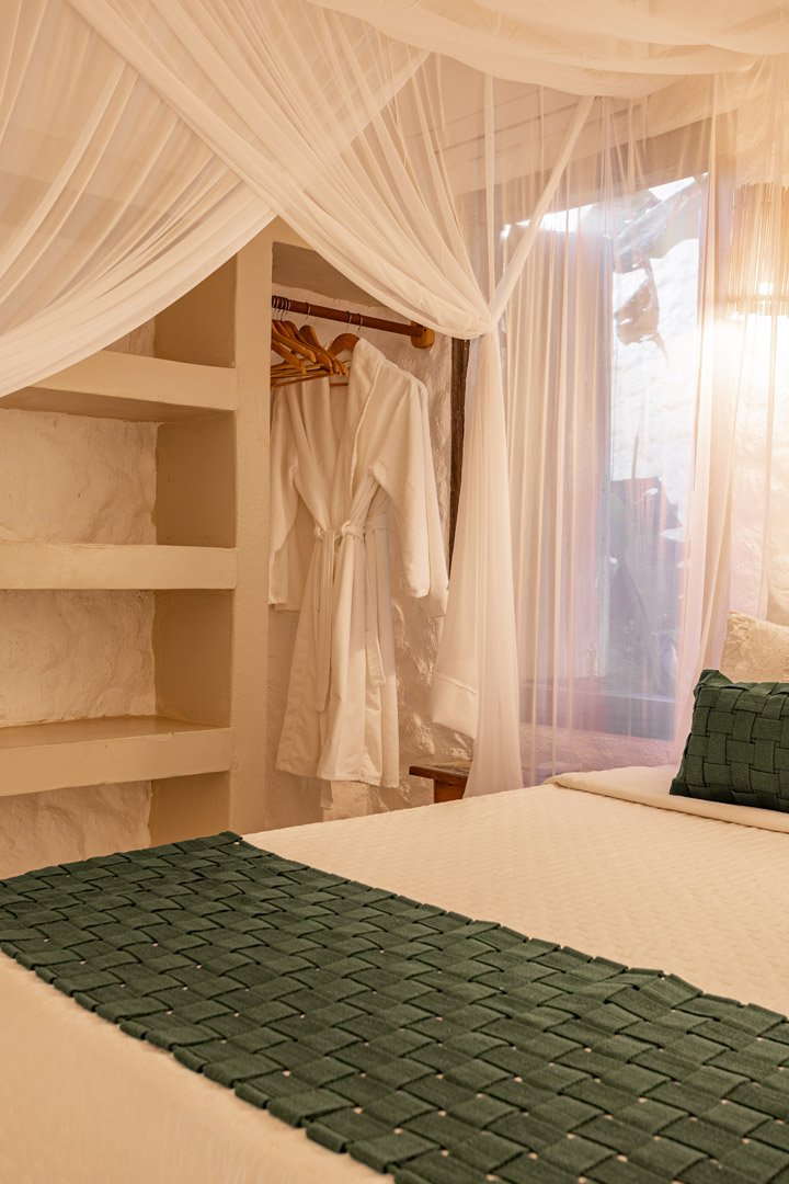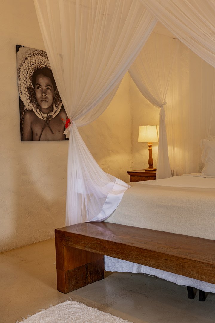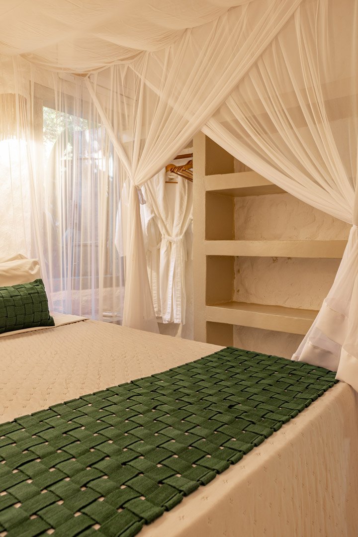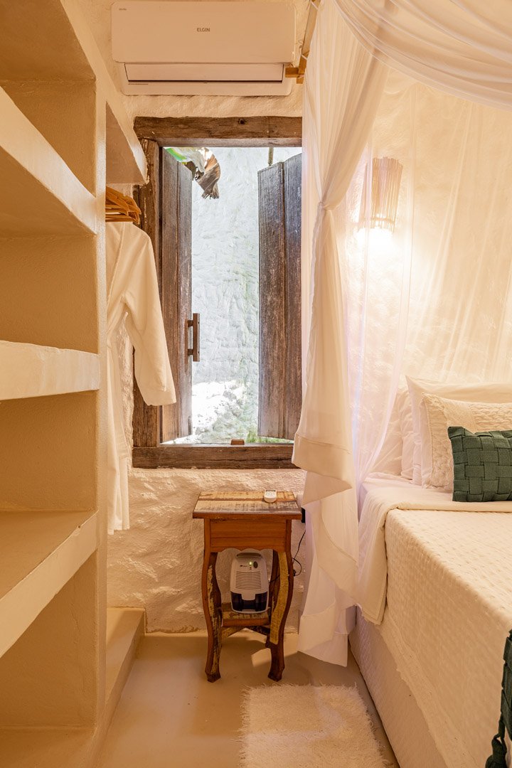 Suíte de 60m² com cama king-size, mosquiteiro dossel e varanda privativa com rede cercada pela Mata Atlântica. Closet amplo, área de estar e banheiro com amenities premium. Luxo despretensioso em meio ao jardim tropical de Trancoso.