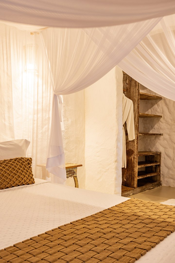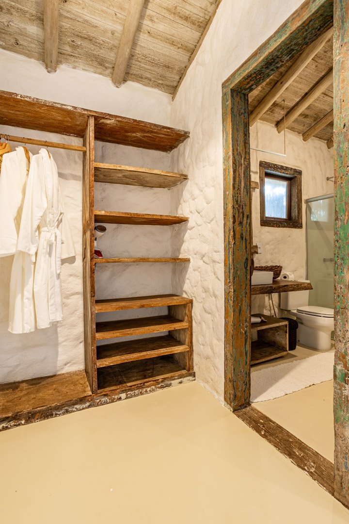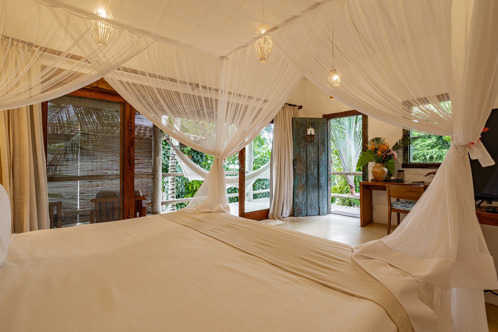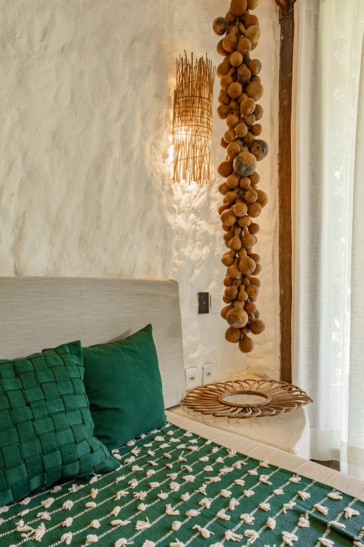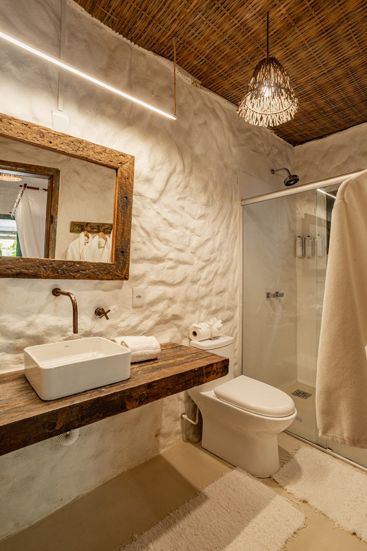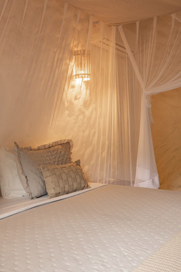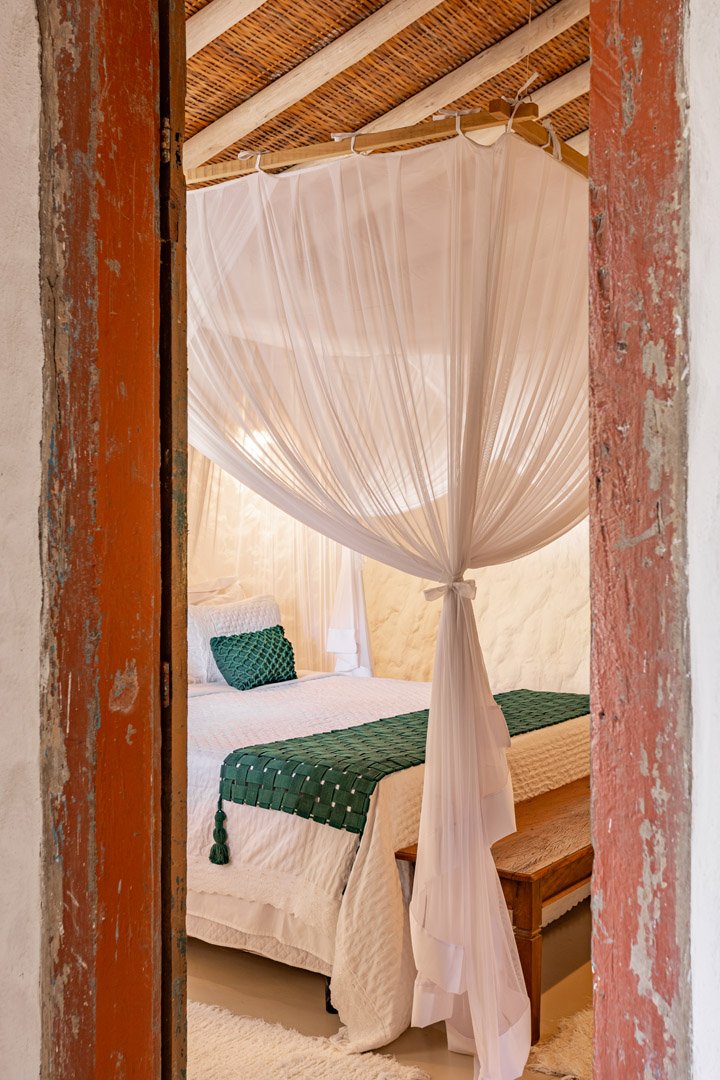 Suíte de 60m² com cama king-size, mosquiteiro dossel e varanda privativa com rede cercada pela Mata Atlântica. Closet amplo, área de estar e banheiro com amenities premium. Luxo despretensioso em meio ao jardim tropical de Trancoso.