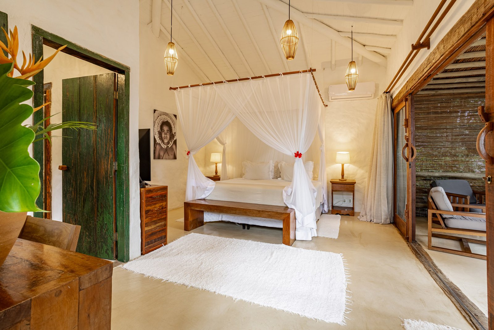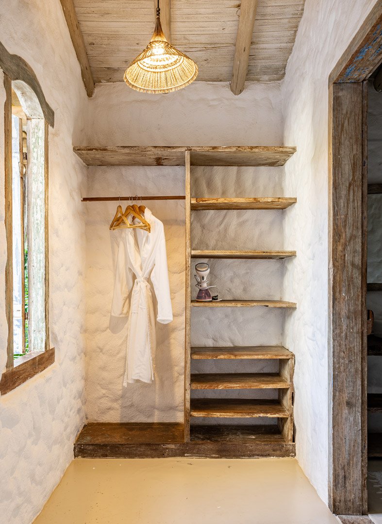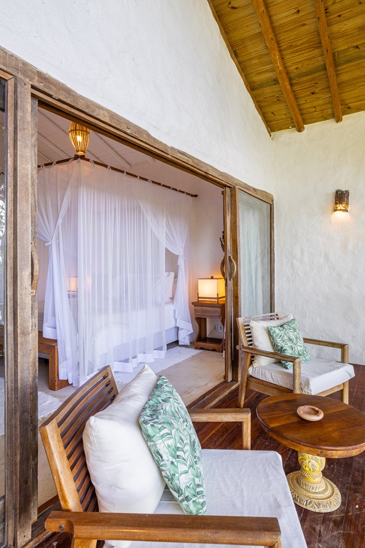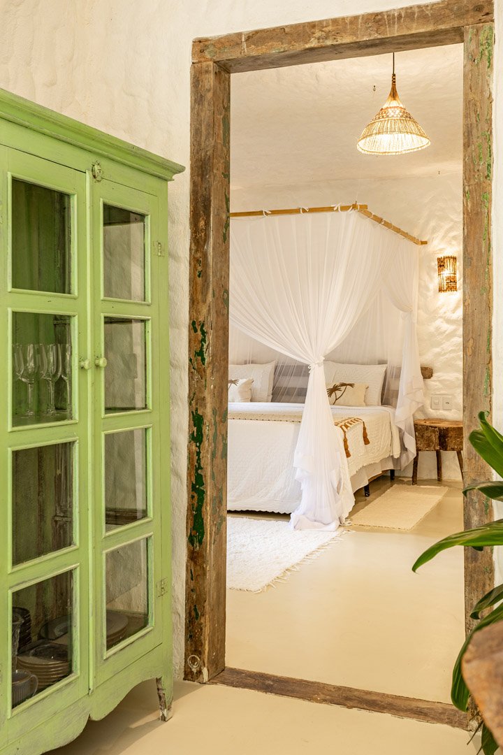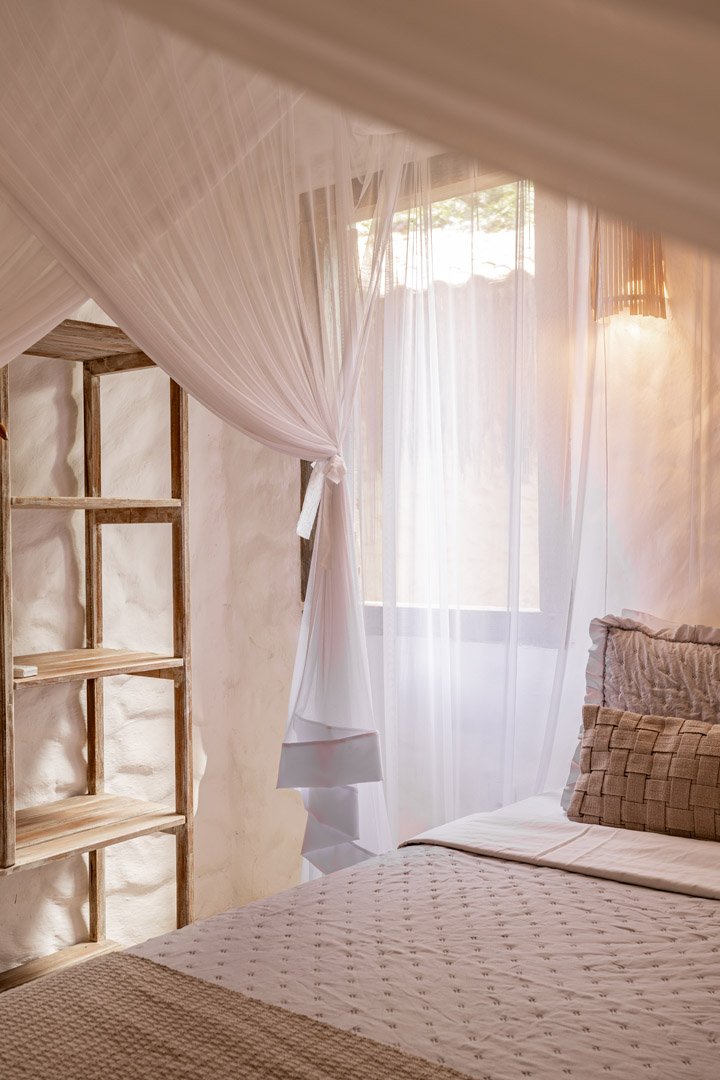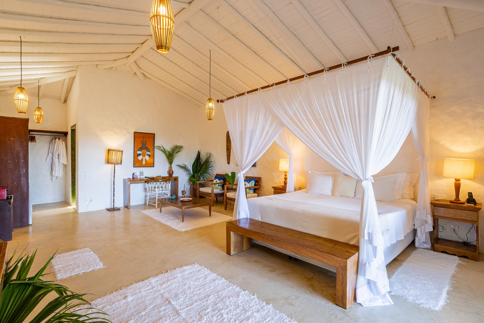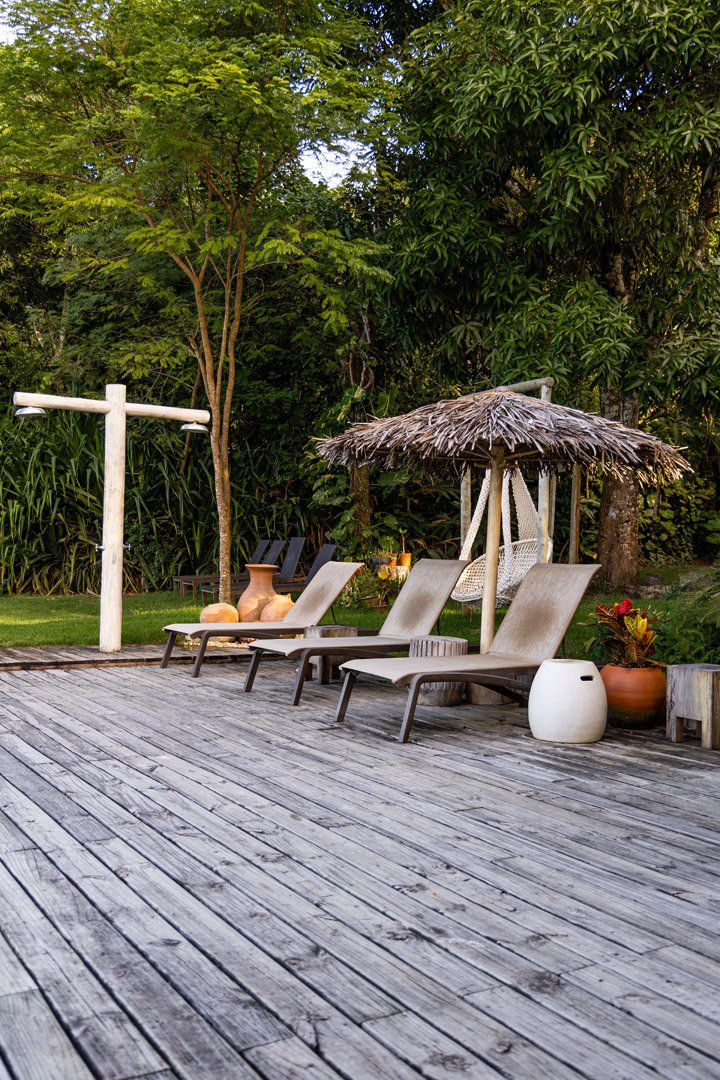 Suíte de 60m² com cama king-size, mosquiteiro dossel e varanda privativa com rede cercada pela Mata Atlântica. Closet amplo, área de estar e banheiro com amenities premium. Luxo despretensioso em meio ao jardim tropical de Trancoso.