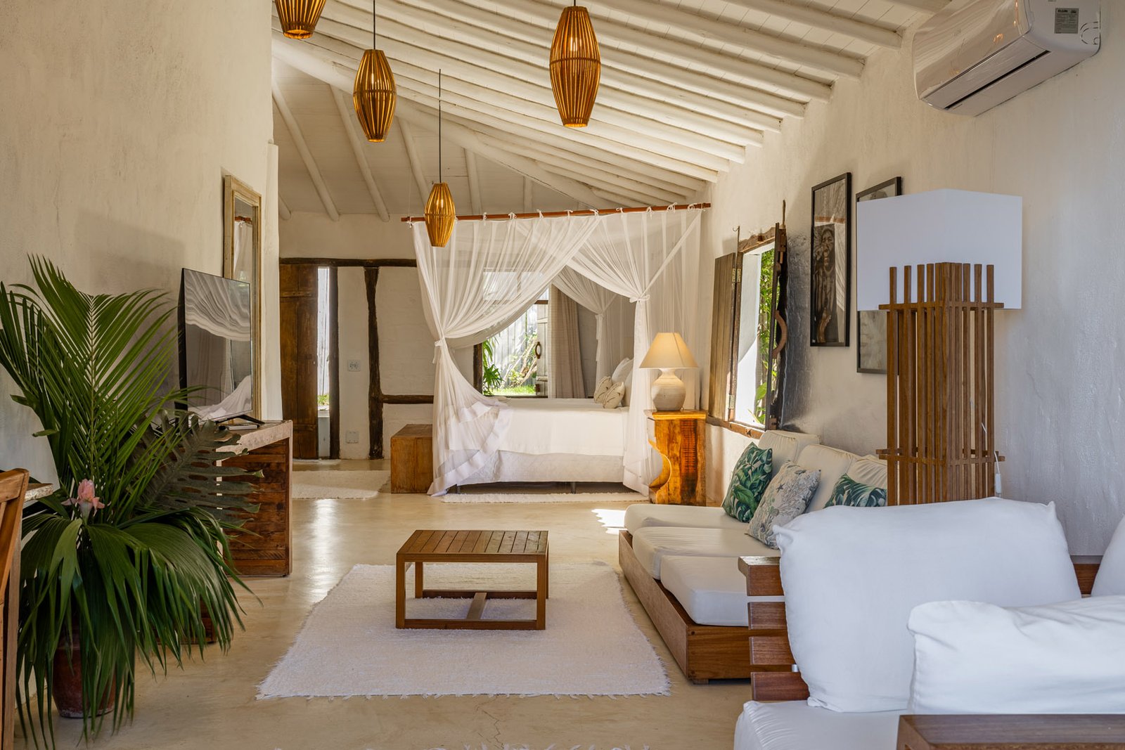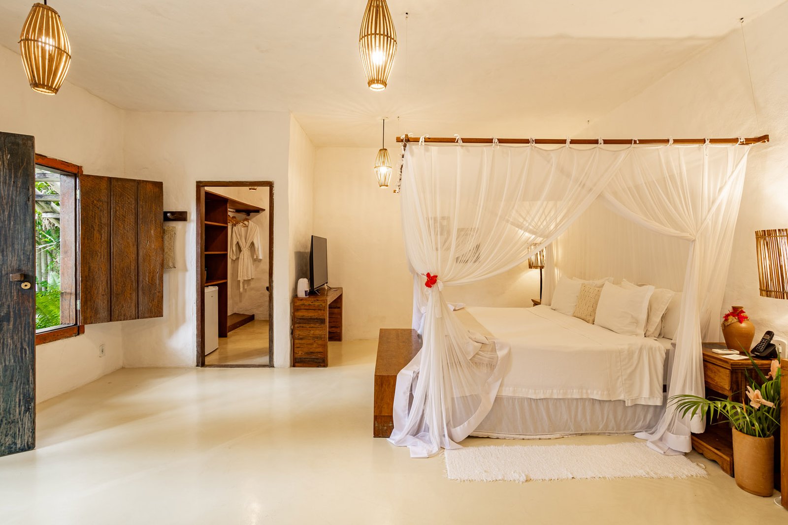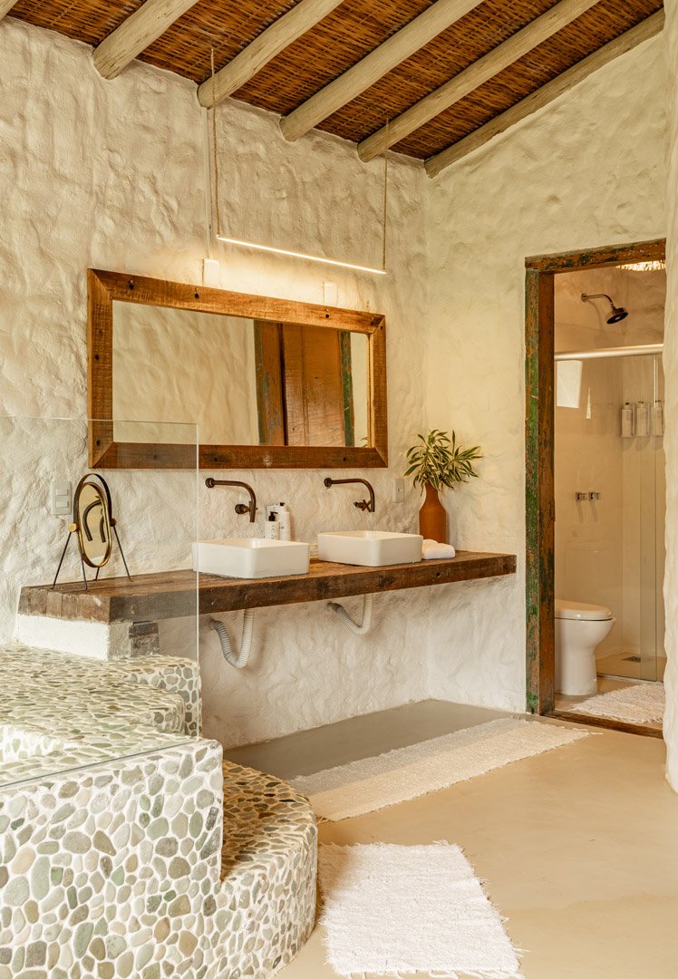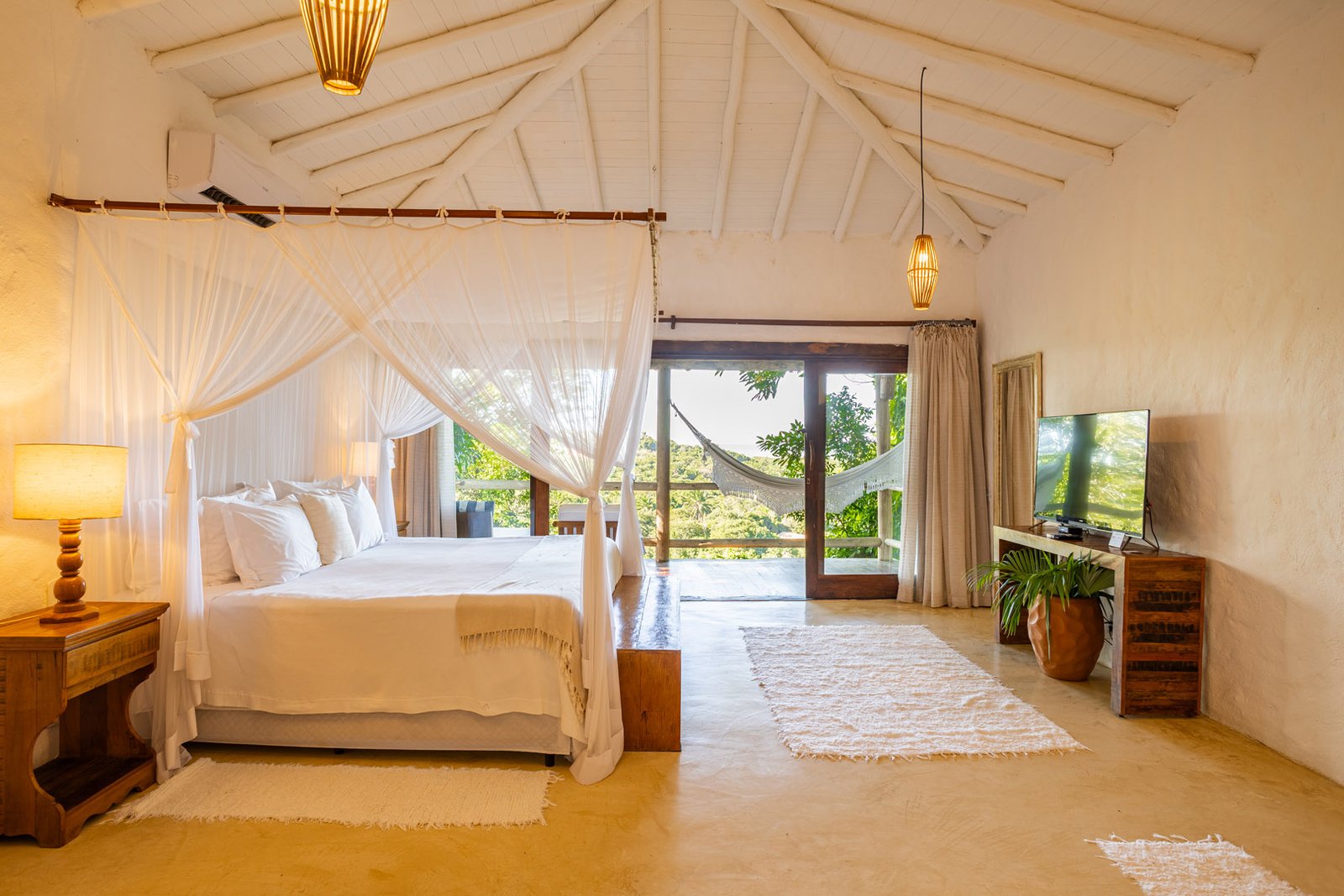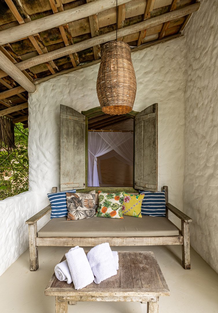 Suíte de 60m² com cama king-size, mosquiteiro dossel e varanda privativa com rede cercada pela Mata Atlântica. Closet amplo, área de estar e banheiro com amenities premium. Luxo despretensioso em meio ao jardim tropical de Trancoso.