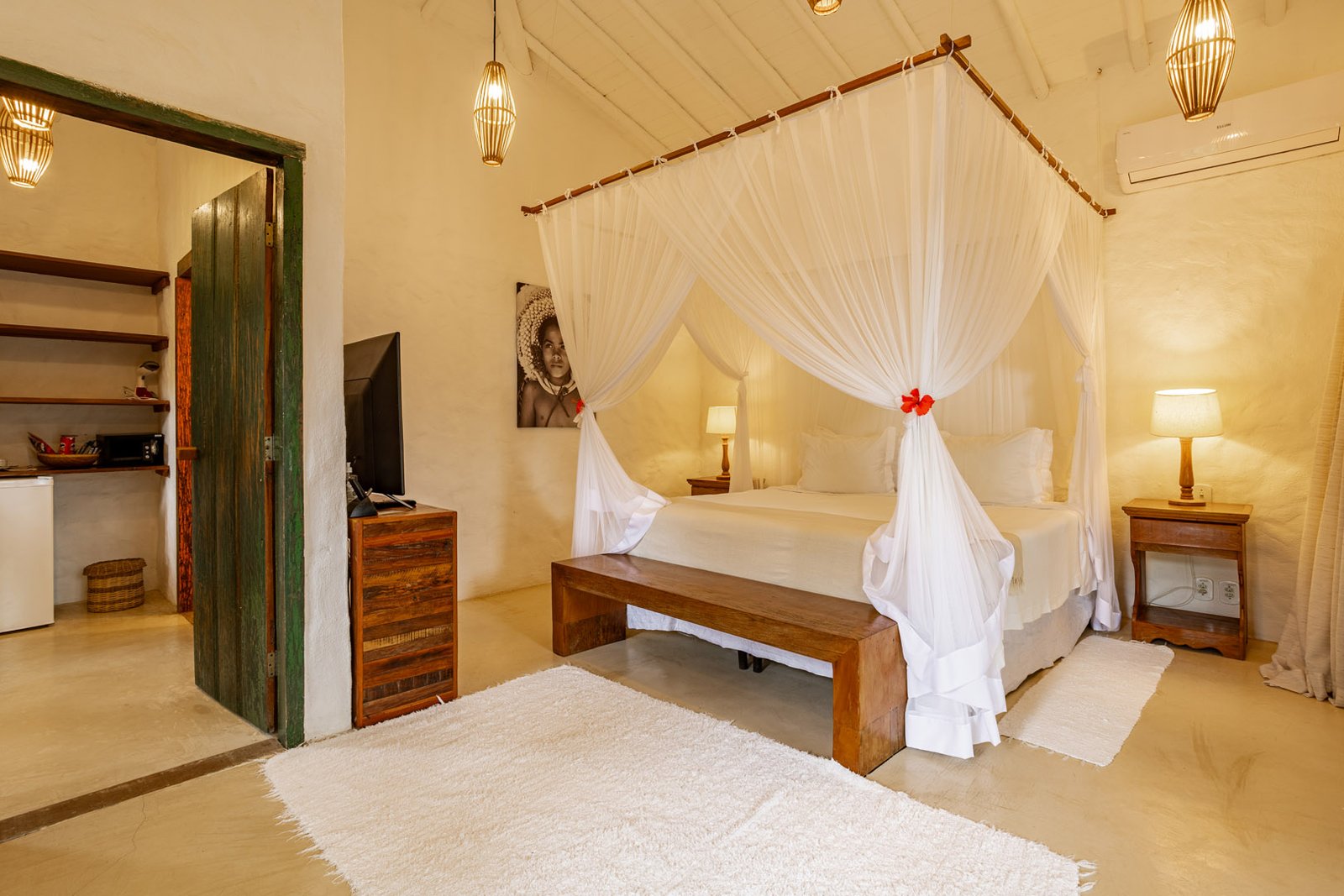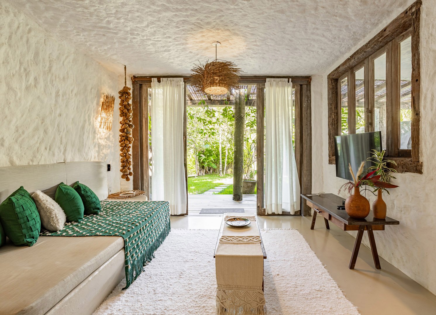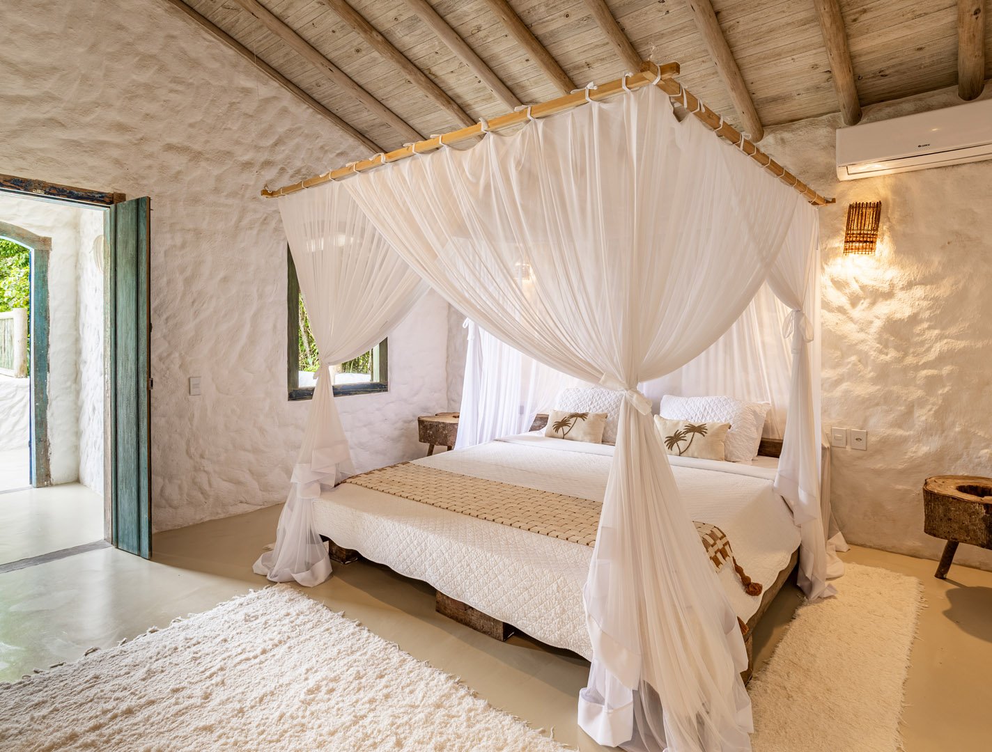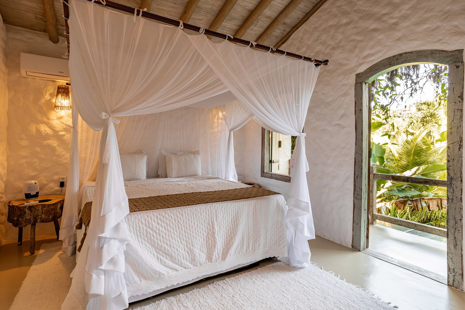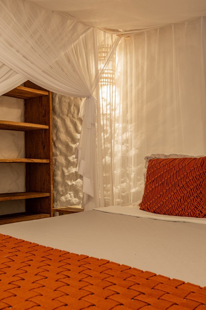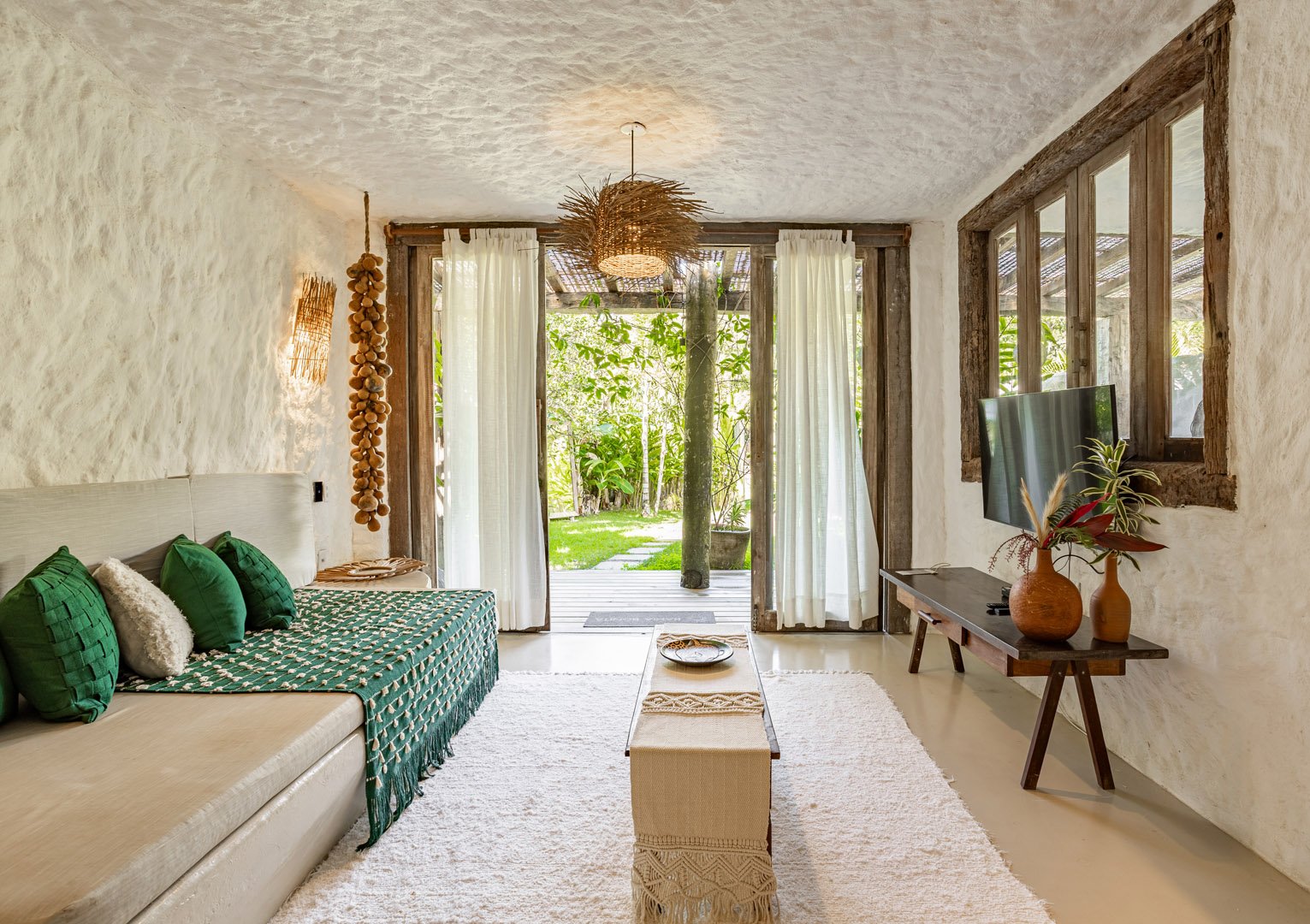 Suíte de 60m² com cama king-size, mosquiteiro dossel e varanda privativa com rede cercada pela Mata Atlântica. Closet amplo, área de estar e banheiro com amenities premium. Luxo despretensioso em meio ao jardim tropical de Trancoso.