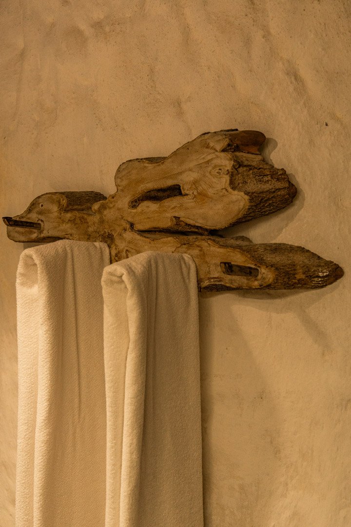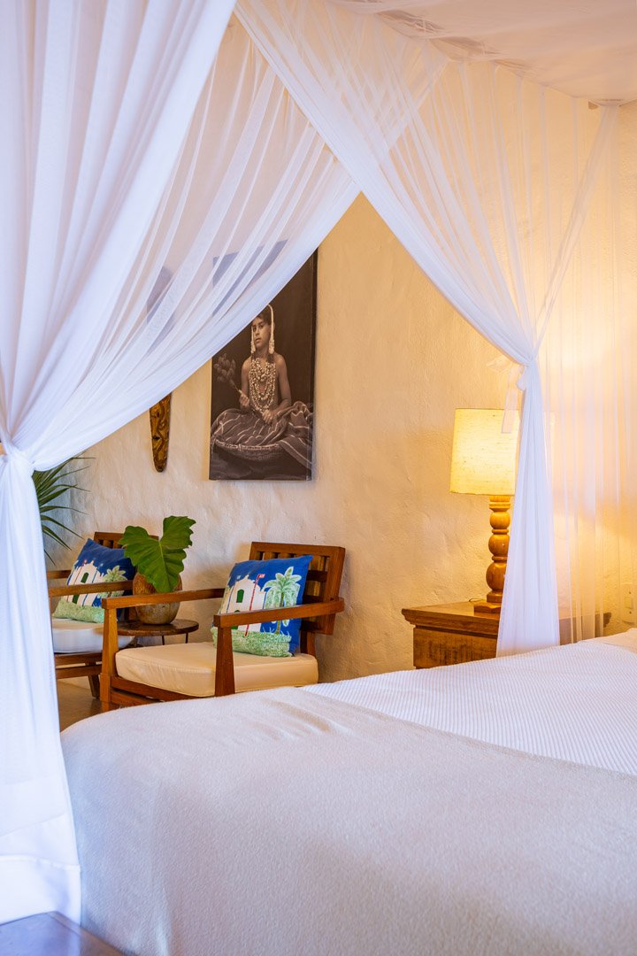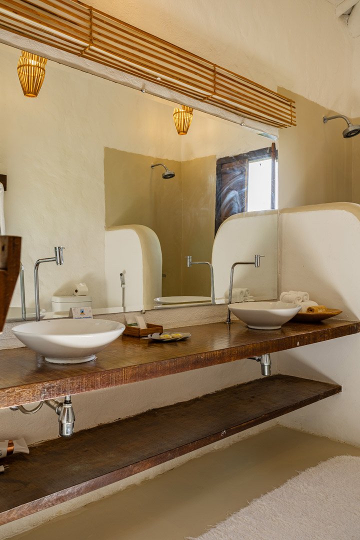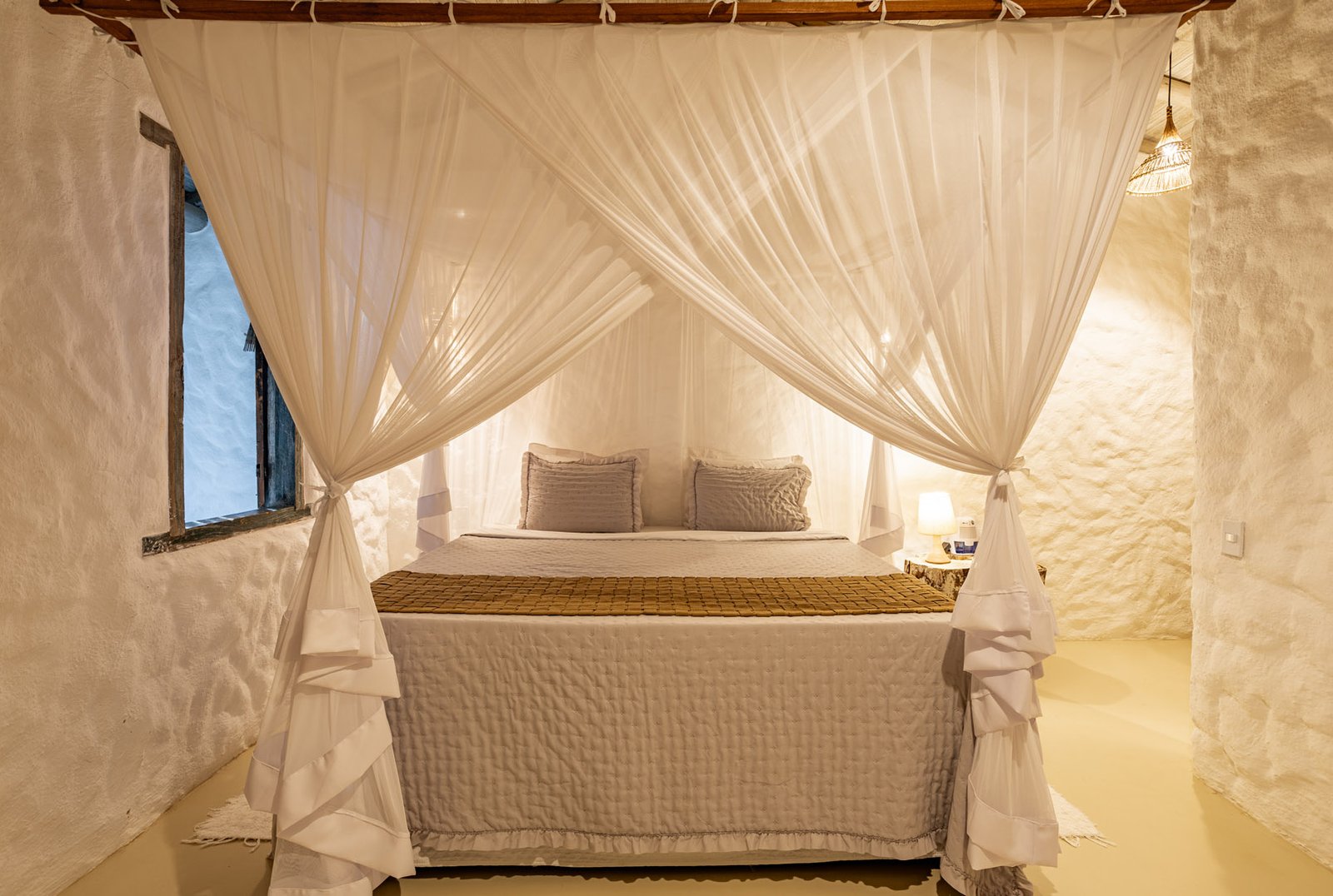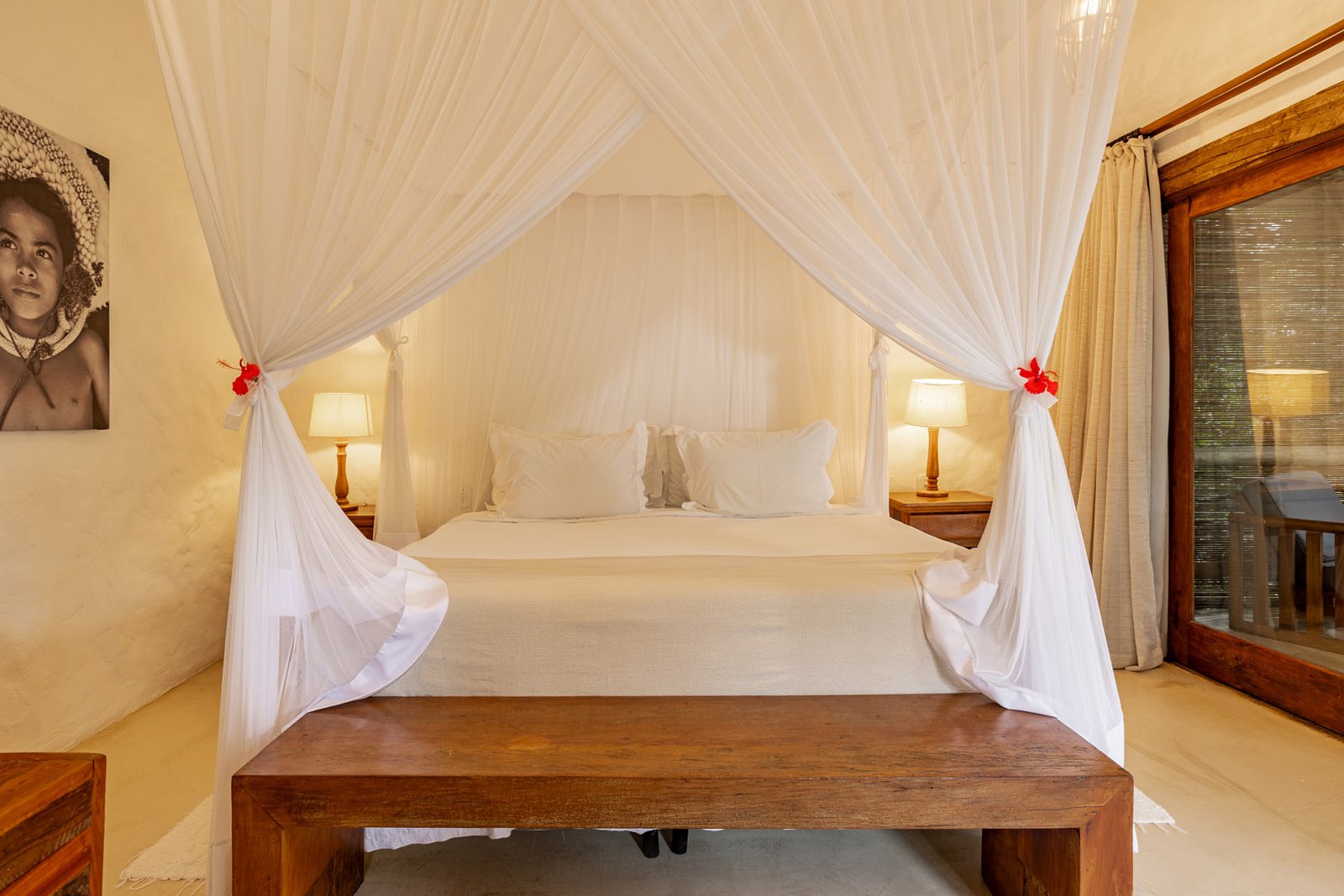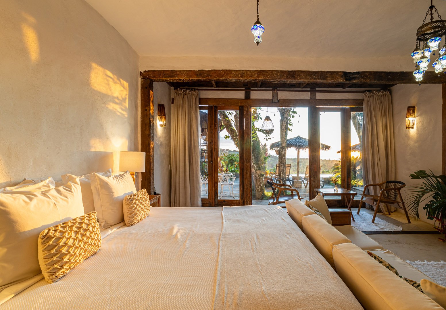 Suíte de 60m² com cama king-size, mosquiteiro dossel e varanda privativa com rede cercada pela Mata Atlântica. Closet amplo, área de estar e banheiro com amenities premium. Luxo despretensioso em meio ao jardim tropical de Trancoso.
