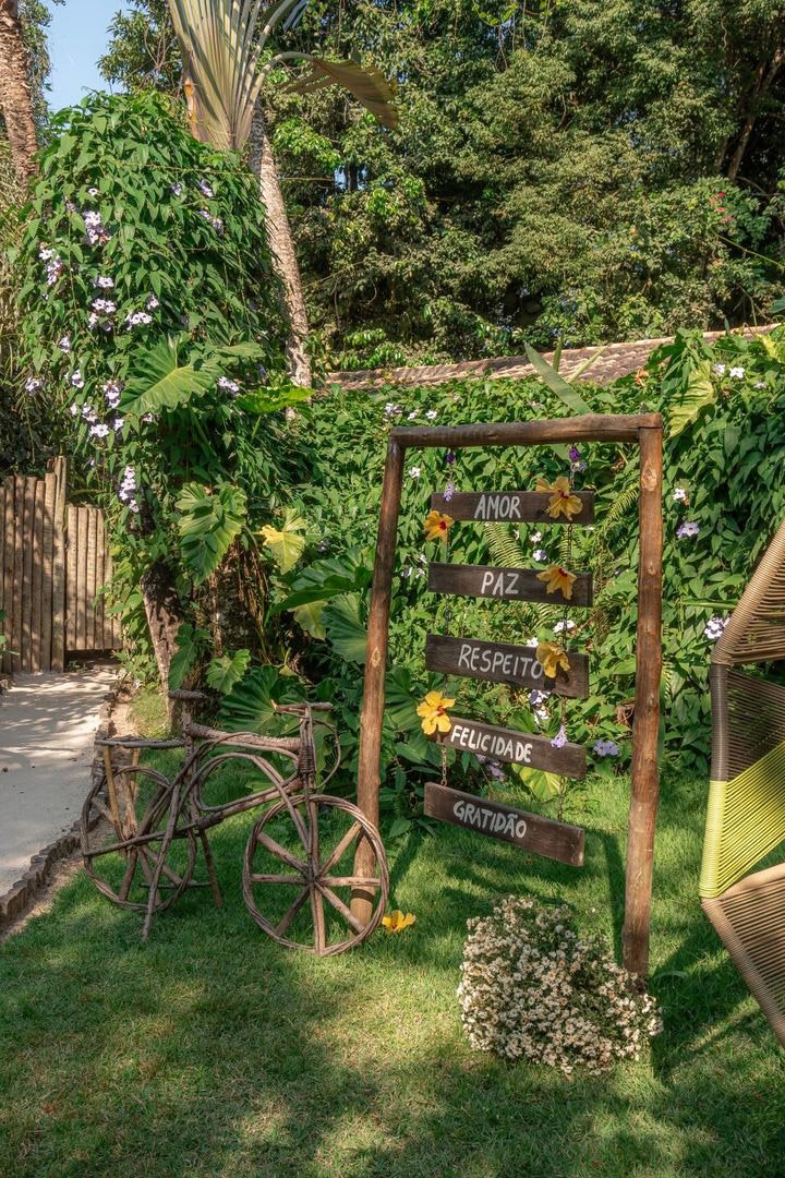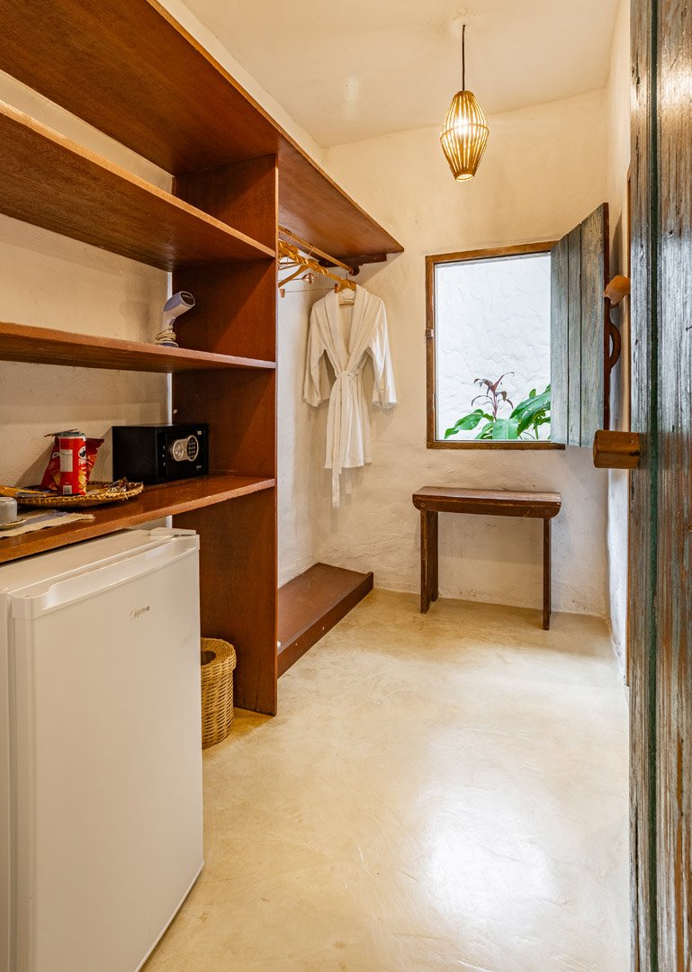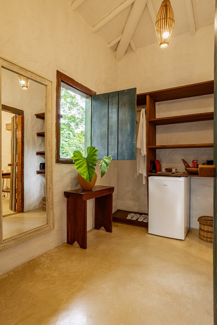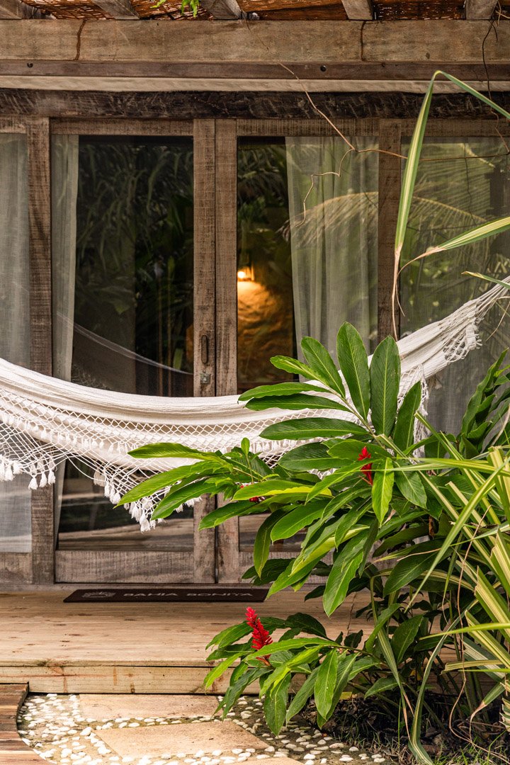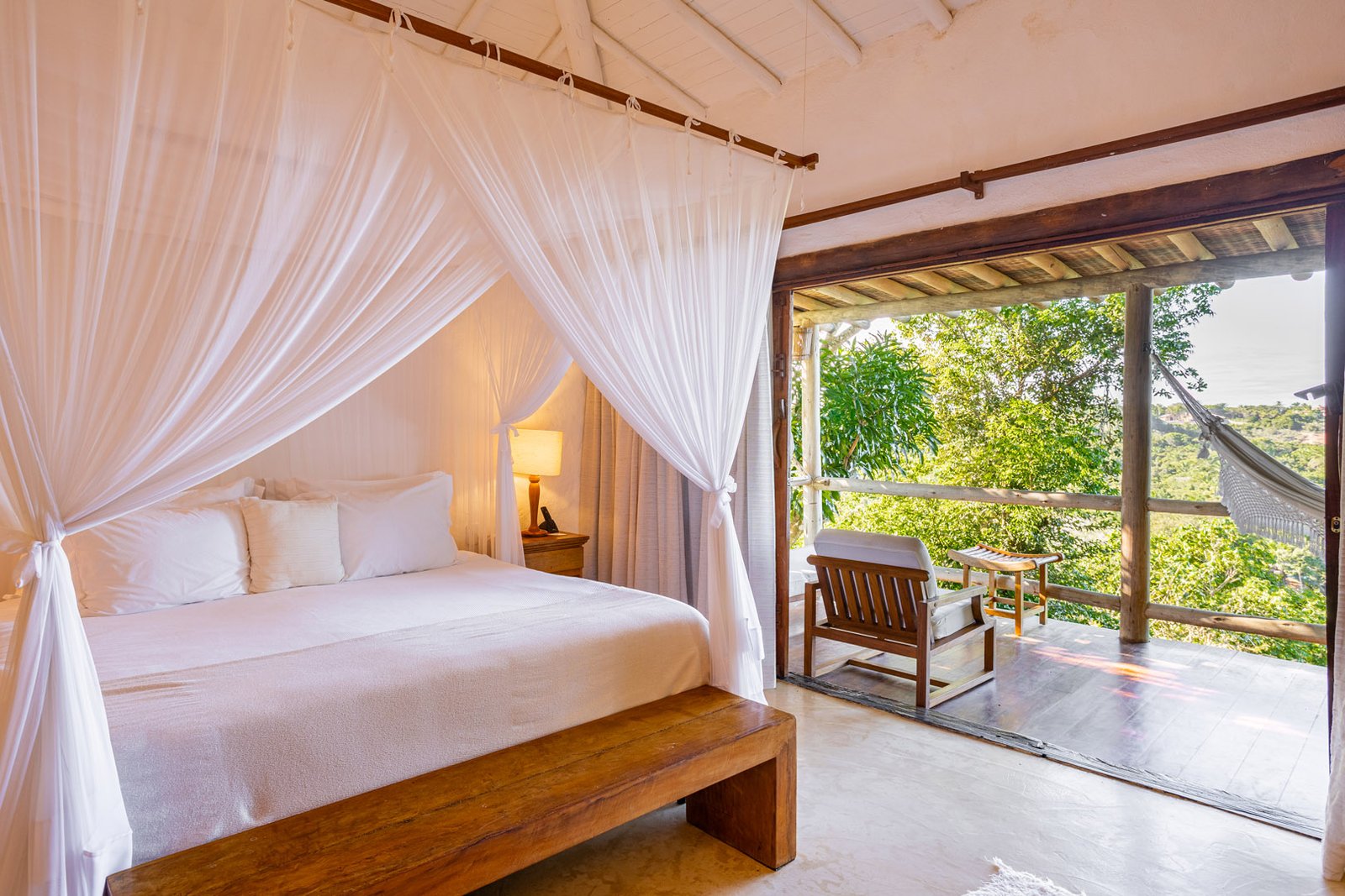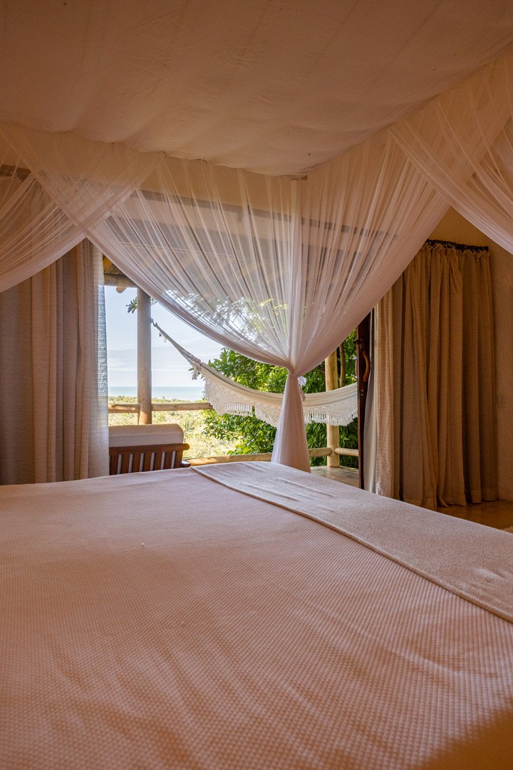 Suíte de 65m² no térreo com varanda privativa, rede e vista para jardim cercado pela Mata Atlântica. Cama king-size com mosquiteiro dossel, closet amplo e decoração com elementos naturais baianos. Conforto acessível para até 3 pessoas.