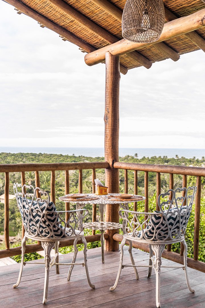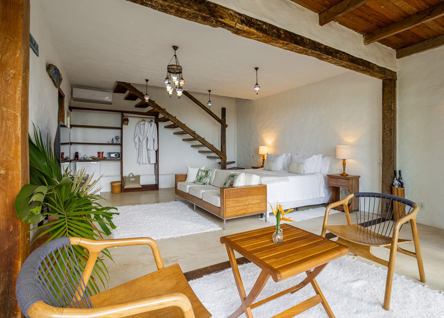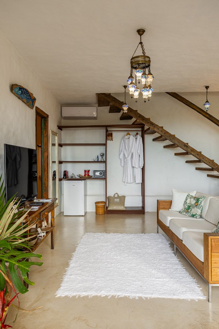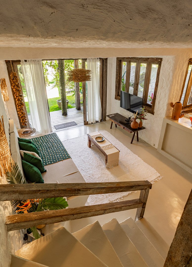 Suíte duplex de 110m² em dois andares com banheira de hidromassagem privativa e vista panorâmica do mar. Duas camas king-size com mosquiteiros, amplo terraço e sala de estar. Elegância e privacidade absoluta em Trancoso para até 4 pessoas.