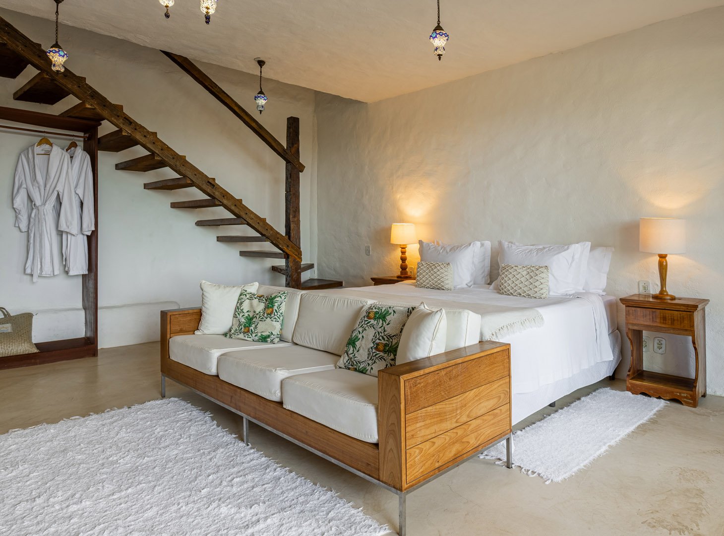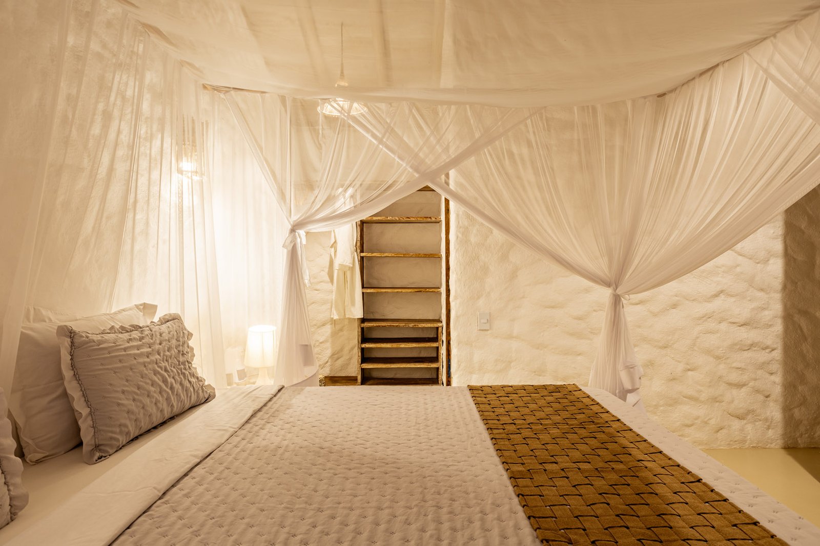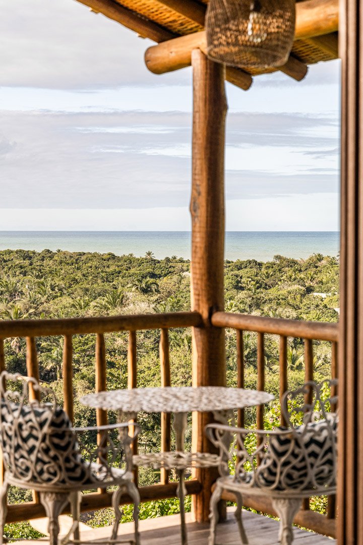 Suíte duplex de 110m² em dois andares com banheira de hidromassagem privativa e vista panorâmica do mar. Duas camas king-size com mosquiteiros, amplo terraço e sala de estar. Elegância e privacidade absoluta em Trancoso para até 4 pessoas.