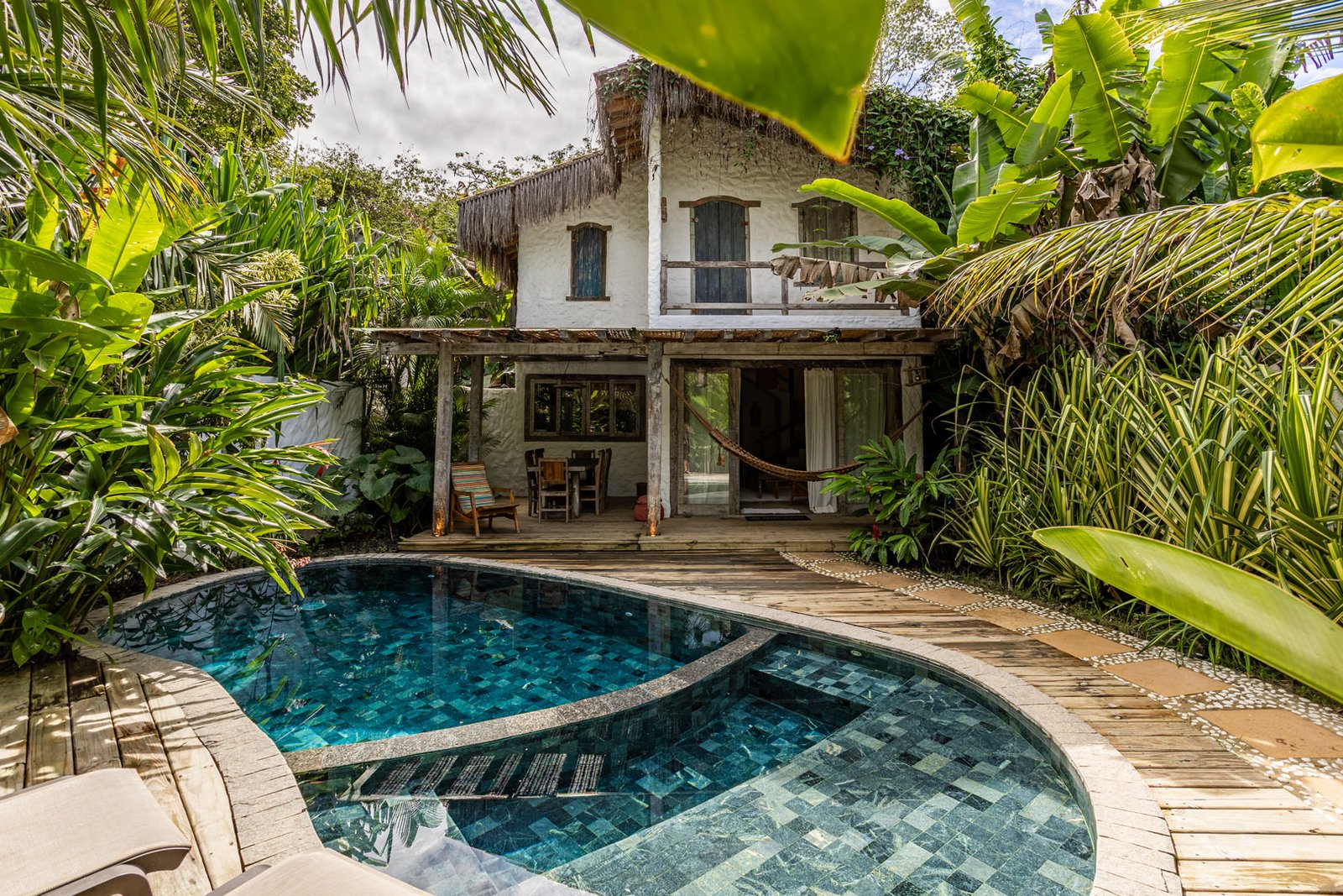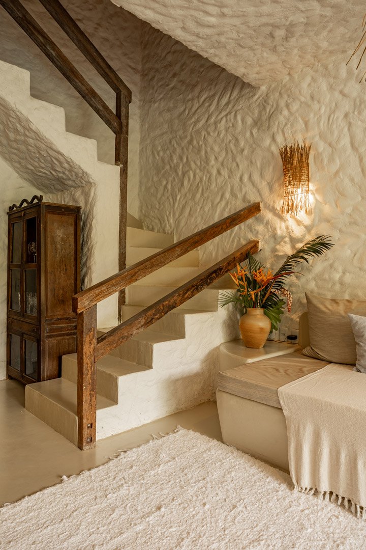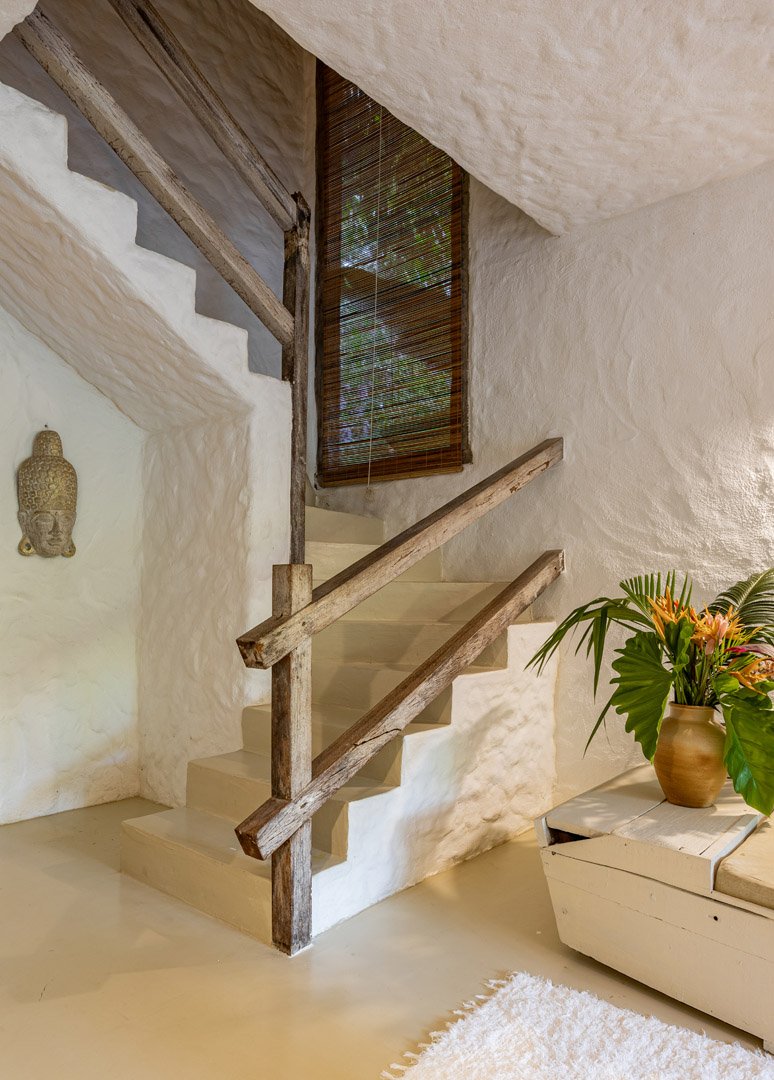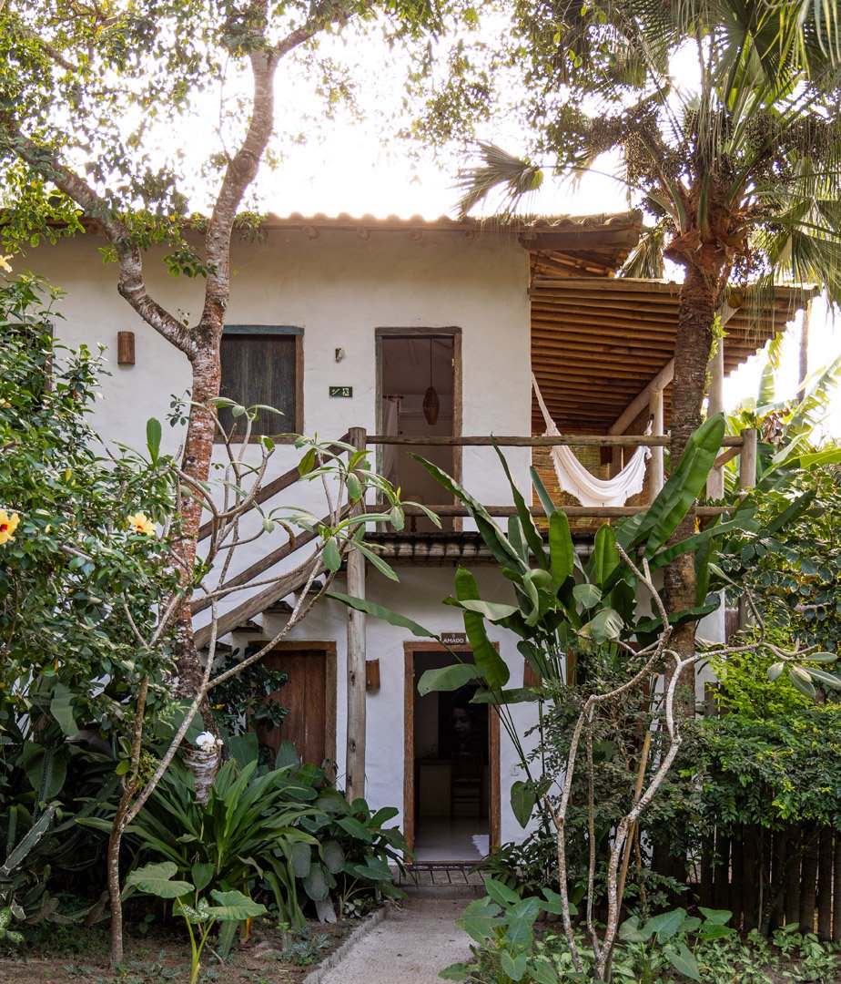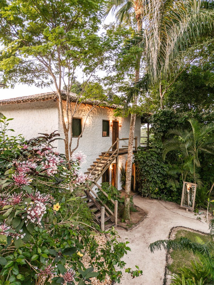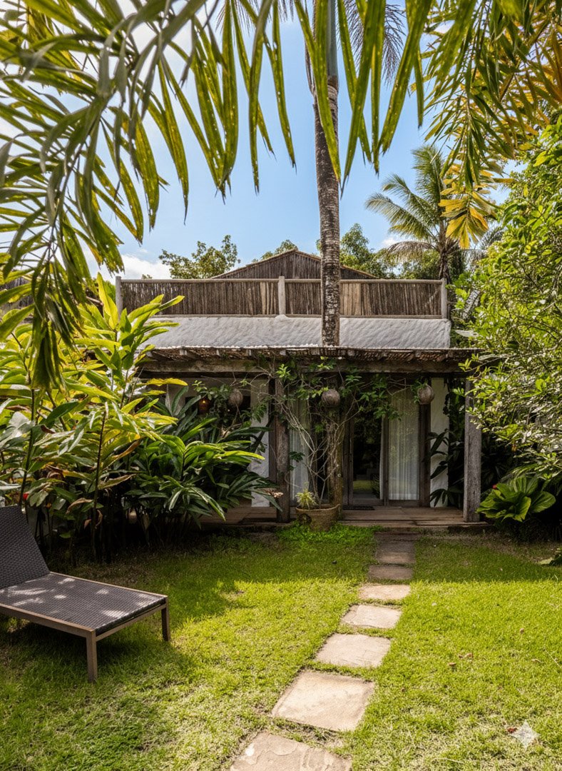 Com 140m² , 2 suítes king-size em andares independentes e piscina-jacuzzi privativa no terraço. Arquitetura baiana integrada ao jardim tropical, cozinha equipada e serviços de hotel boutique. Perfeita para relaxar com privacidade em Trancoso.