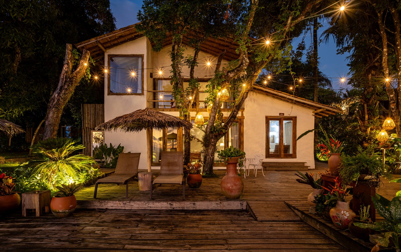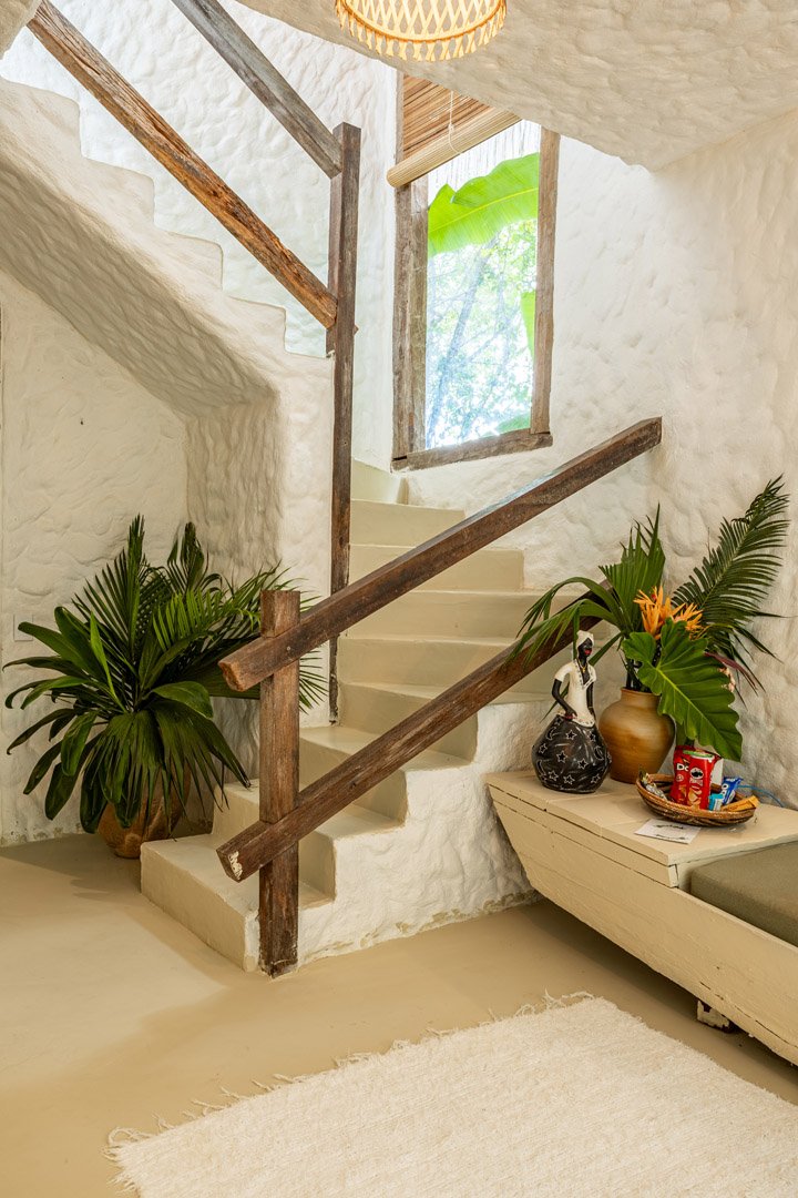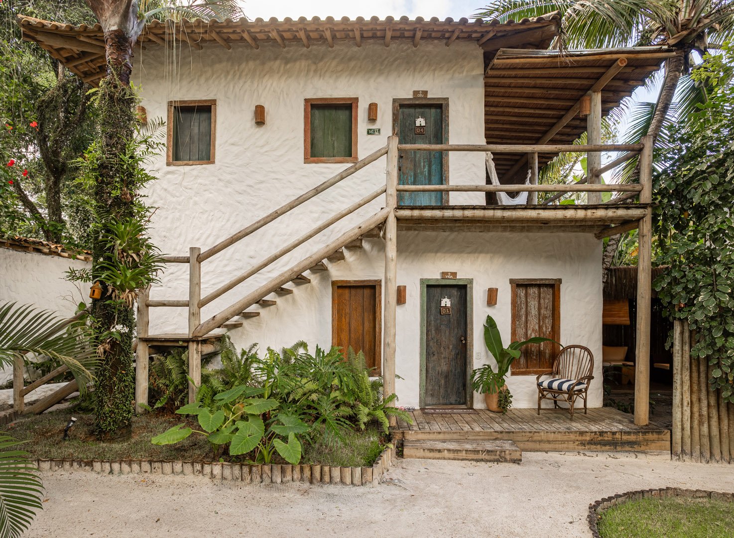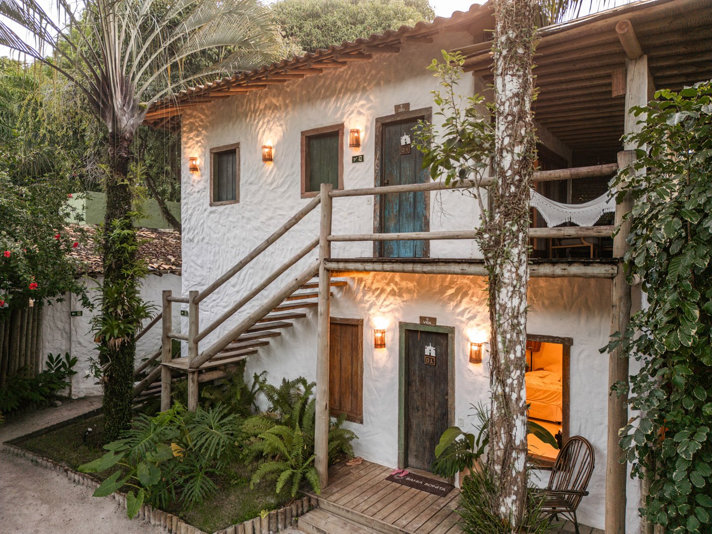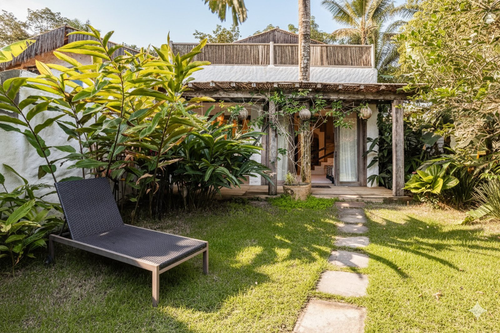 Com 140m² , 2 suítes king-size em andares independentes e piscina-jacuzzi privativa no terraço. Arquitetura baiana integrada ao jardim tropical, cozinha equipada e serviços de hotel boutique. Perfeita para relaxar com privacidade em Trancoso.