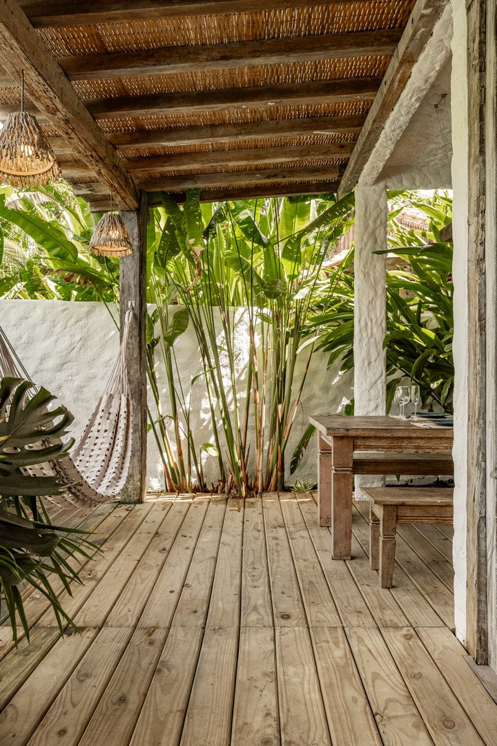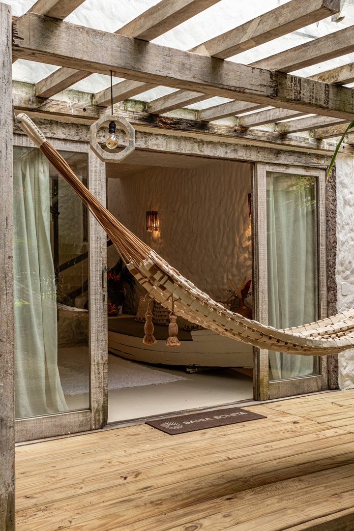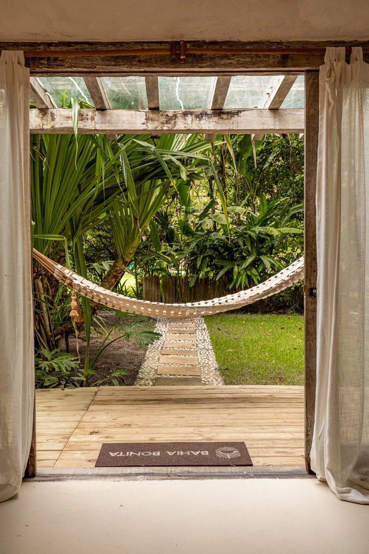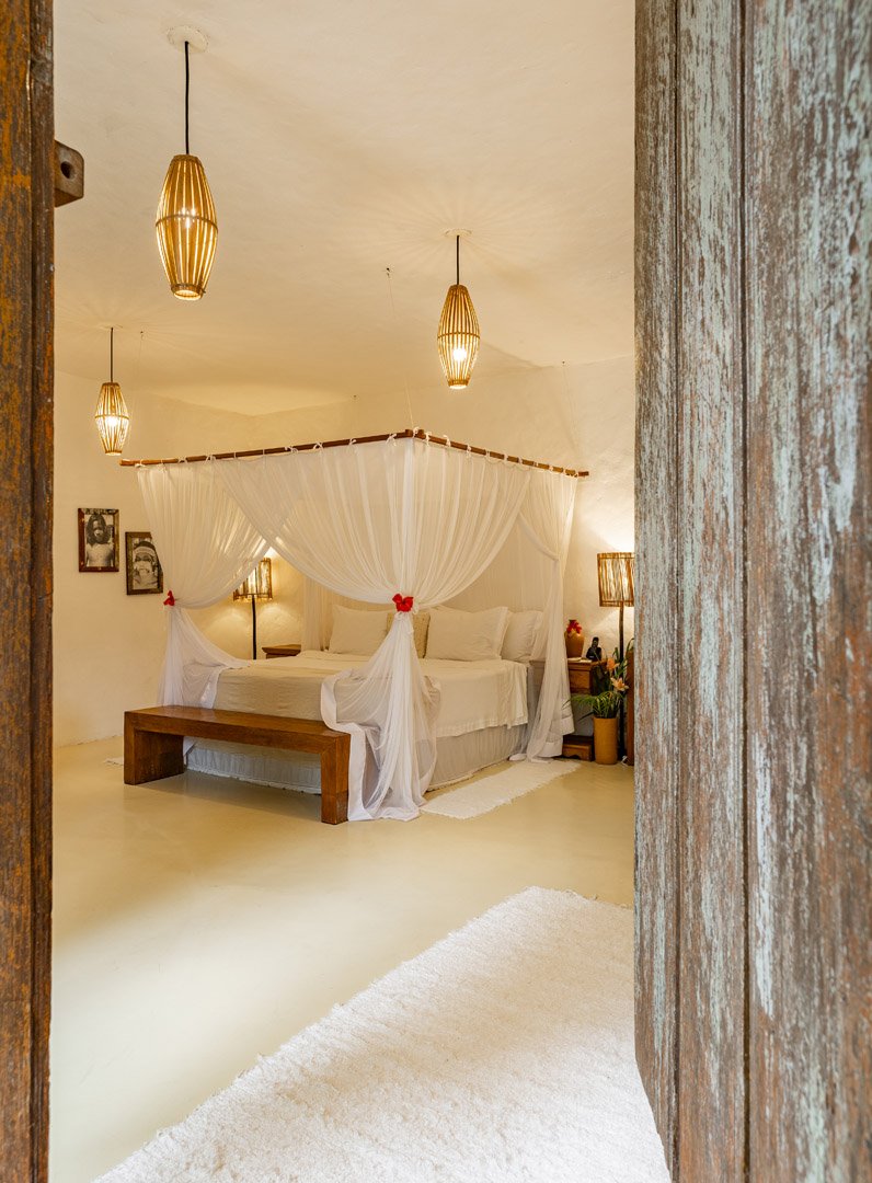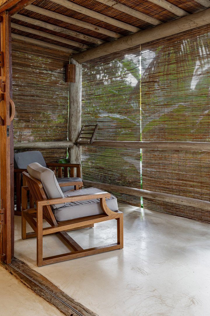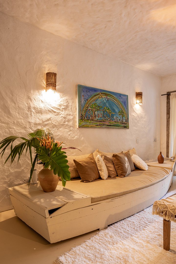 Com 100m² , 3 suítes king-size e mosquiteiros dossel, piscina-jacuzzi privativa no terraço com vista para jardim tropical. Arquitetura baiana contemporânea com áreas fluidas e integradas. Serviços completos de hotel boutique para até 6 pessoas.