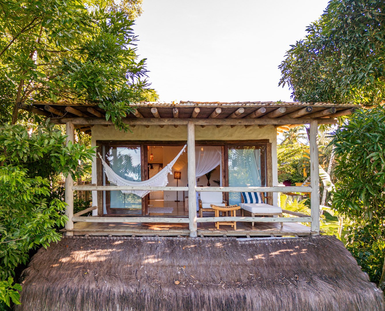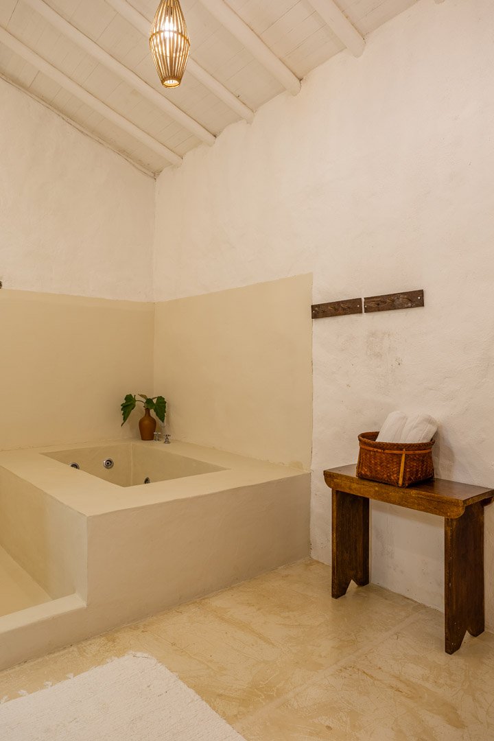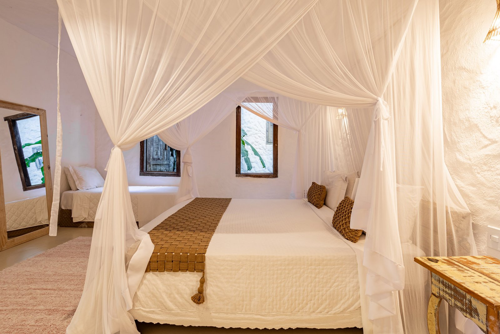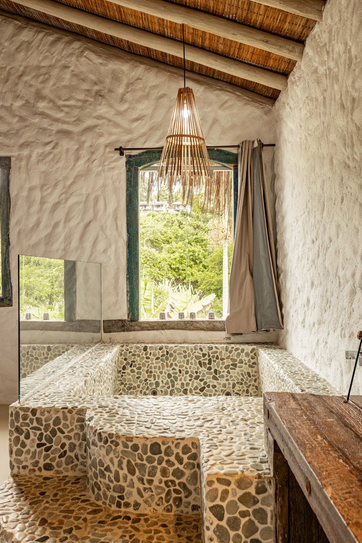 Com 100m² , 3 suítes king-size e mosquiteiros dossel, piscina-jacuzzi privativa no terraço com vista para jardim tropical. Arquitetura baiana contemporânea com áreas fluidas e integradas. Serviços completos de hotel boutique para até 6 pessoas.