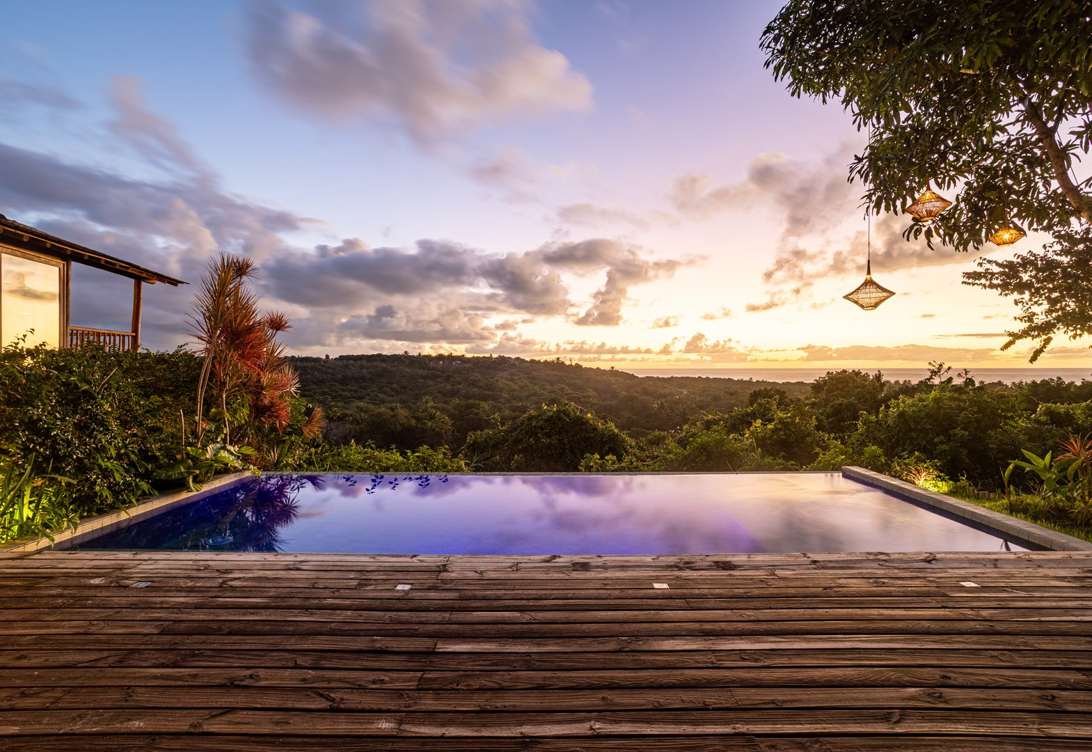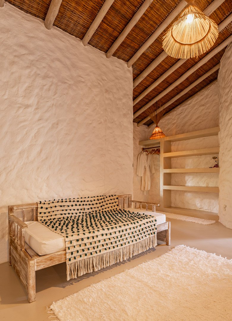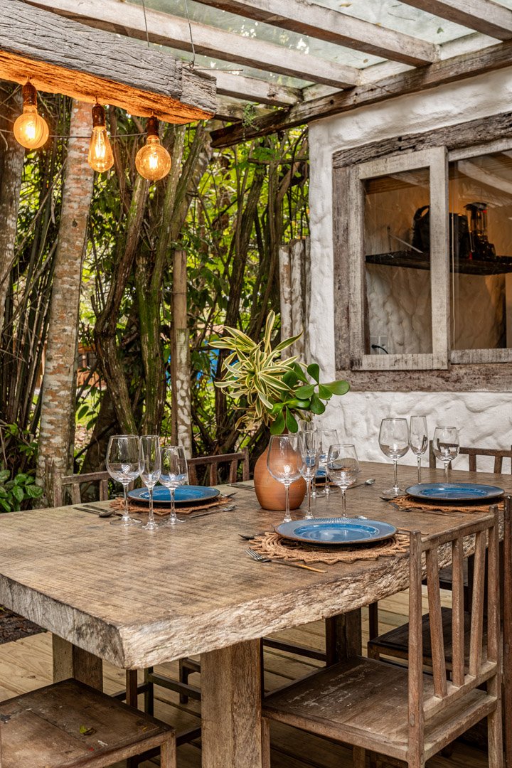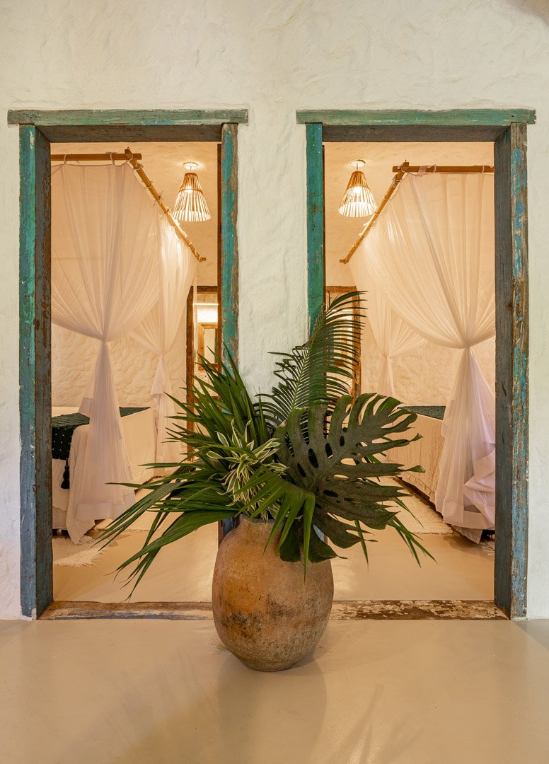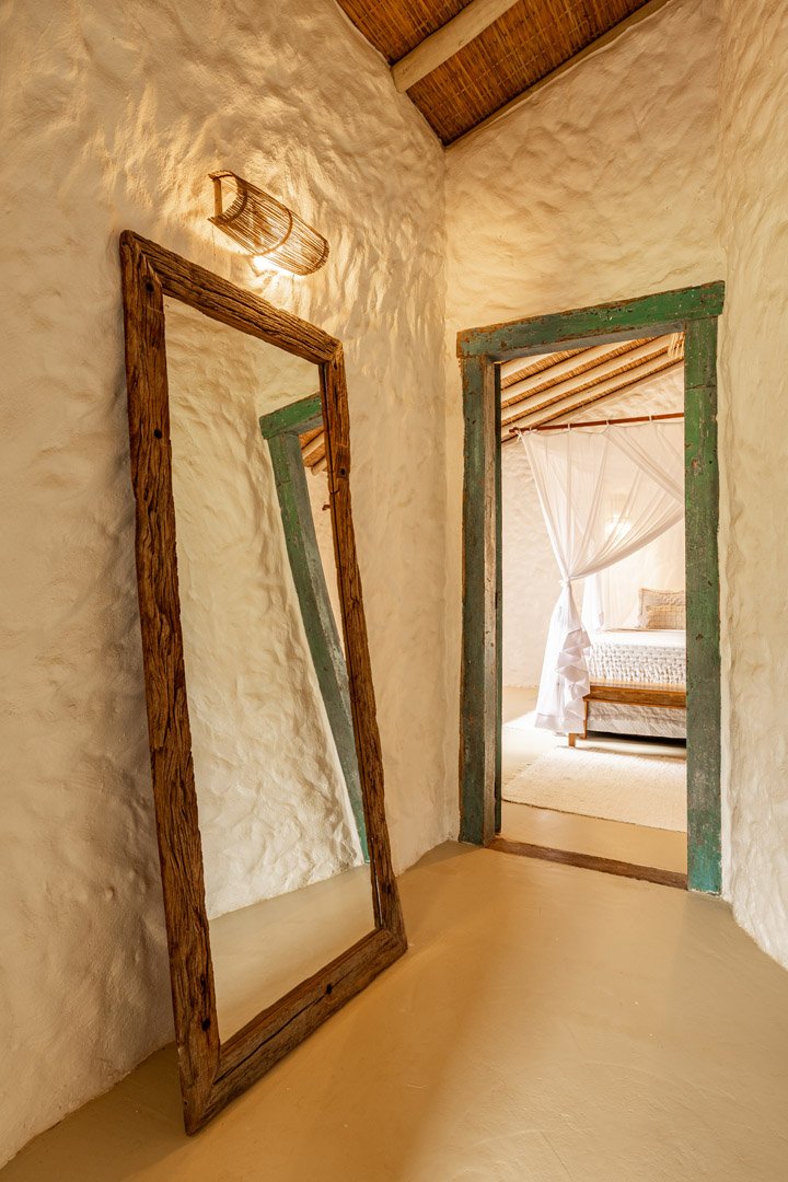 Com 100m² , 3 suítes king-size e mosquiteiros dossel, piscina-jacuzzi privativa no terraço com vista para jardim tropical. Arquitetura baiana contemporânea com áreas fluidas e integradas. Serviços completos de hotel boutique para até 6 pessoas.