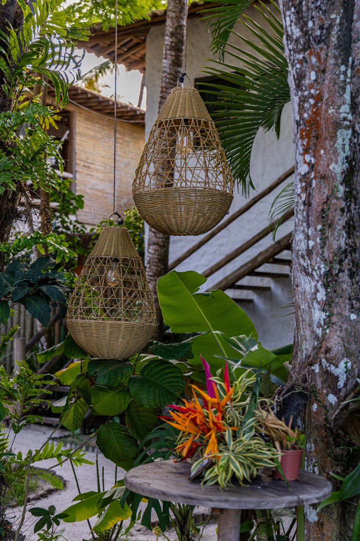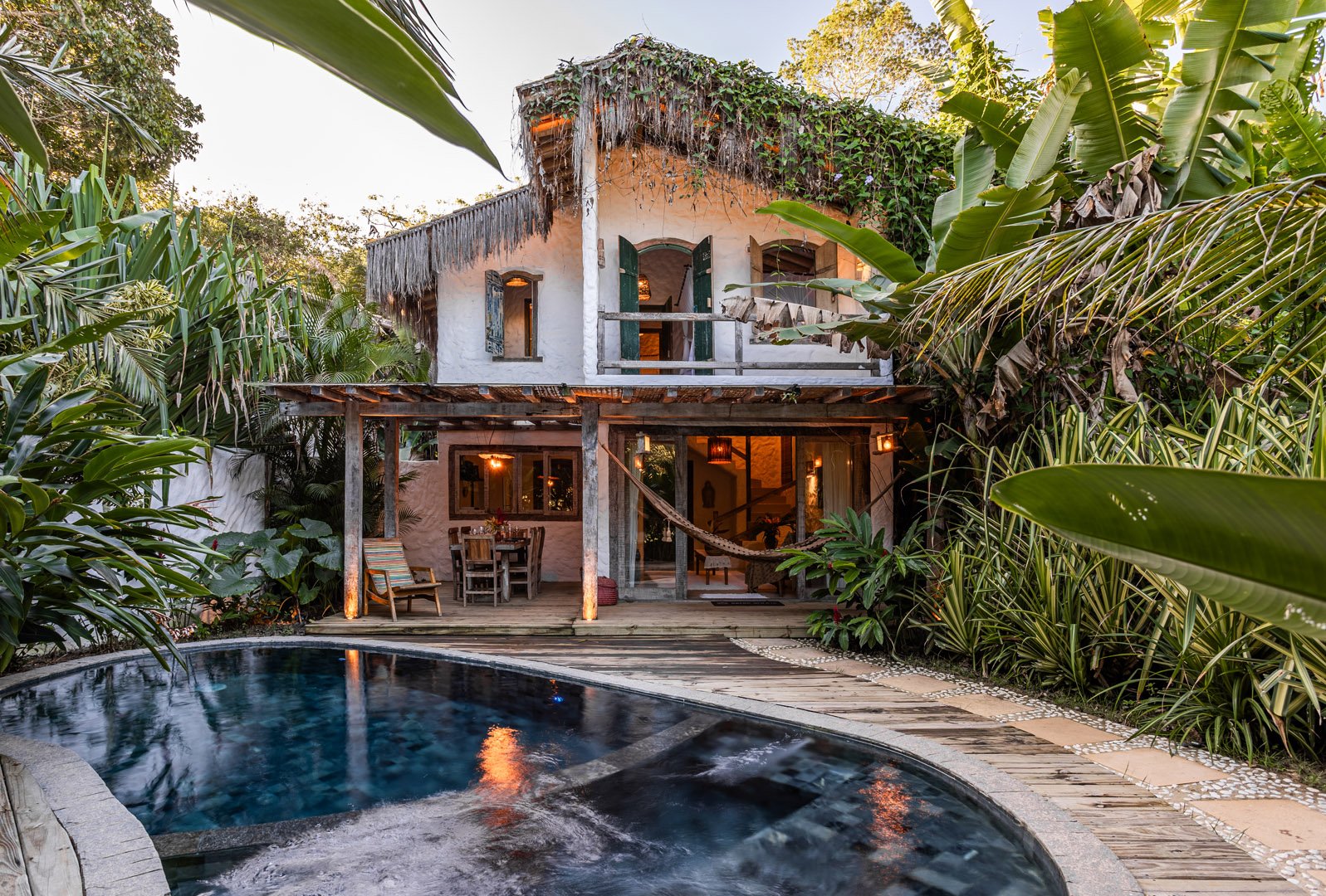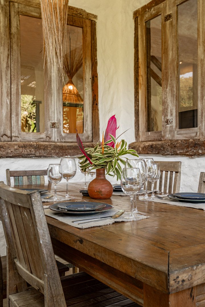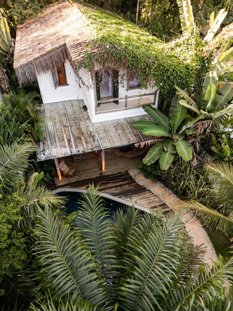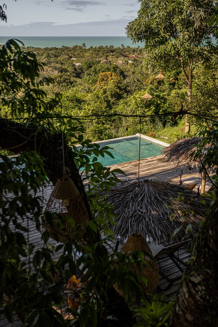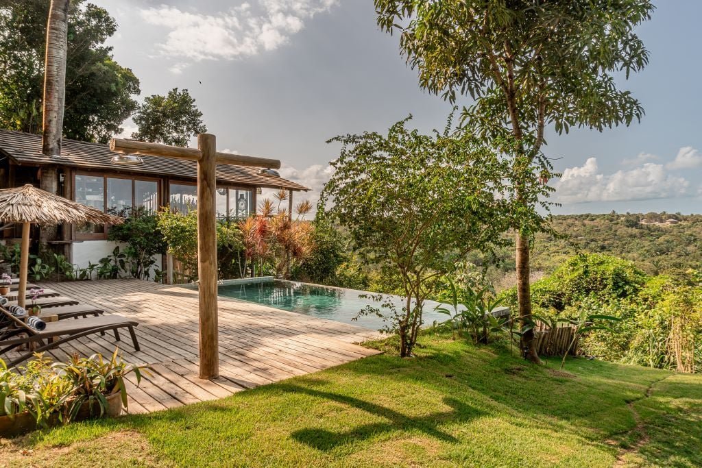 Com 100m², 3 suítes king-size e mosquiteiros dossel, piscina privativa cercada por jardim tropical. Arquitetura baiana com espaços amplos e integrados à natureza. Serviços completos de hotel boutique para até 6 pessoas em Trancoso.