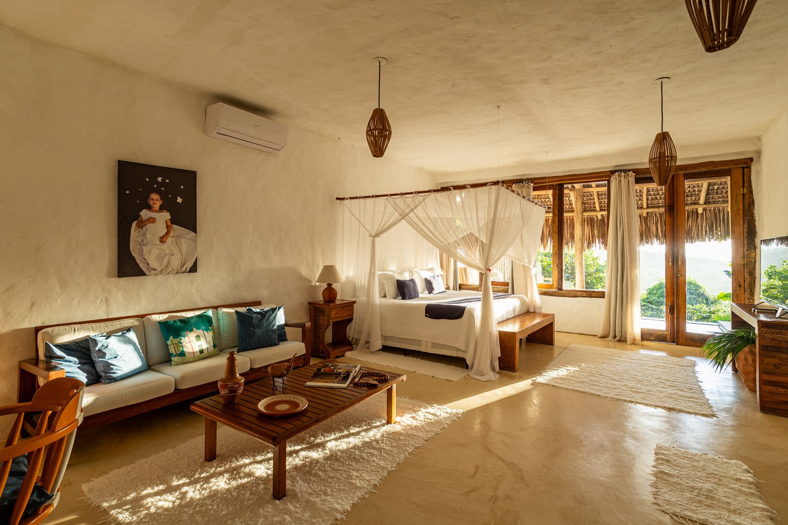 Suíte master de 80m² no primeiro andar com varanda privativa e vista panorâmica do mar. Cama king-size com mosquiteiro dossel, chuveiro duplo, closet amplo e área de estar. Elegância tropical cercada pela Mata Atlântica em Trancoso.